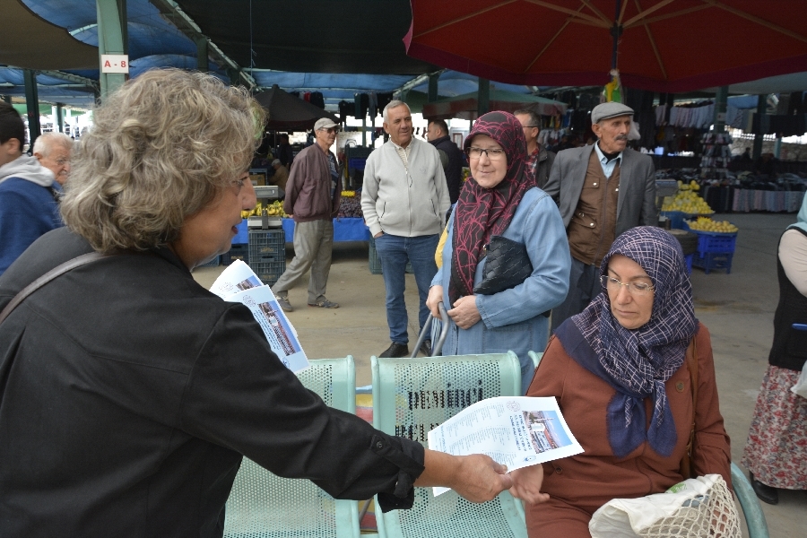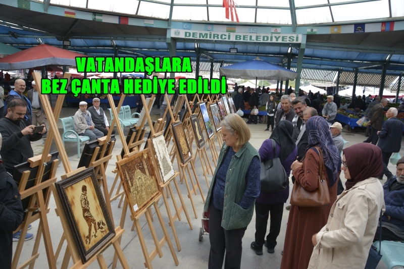 Demirci'de pazarda sanat var sergisinde vatandaşlara belediye ve halk eğitimi merkezi müdürlüğü tarafından bez çanta dağıtıldı.