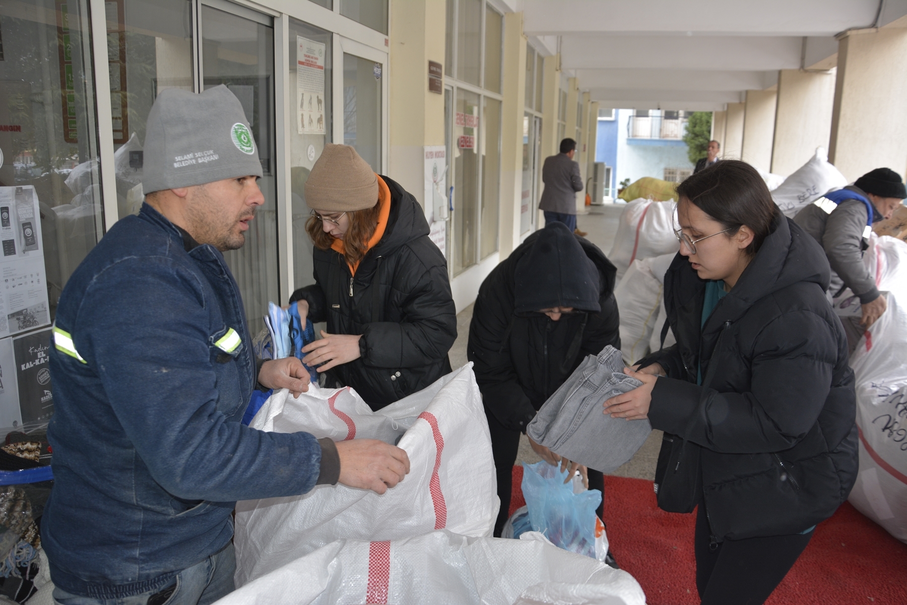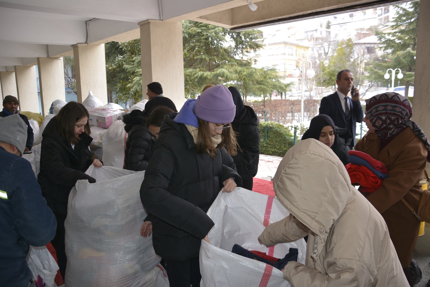 Belediye Başkanı Selami Selçuk'ta belediye hizmet binasında yapılan yardım kampanyasına destek için gelen gençlerle malzeme düzenleme çalışması yaptı.