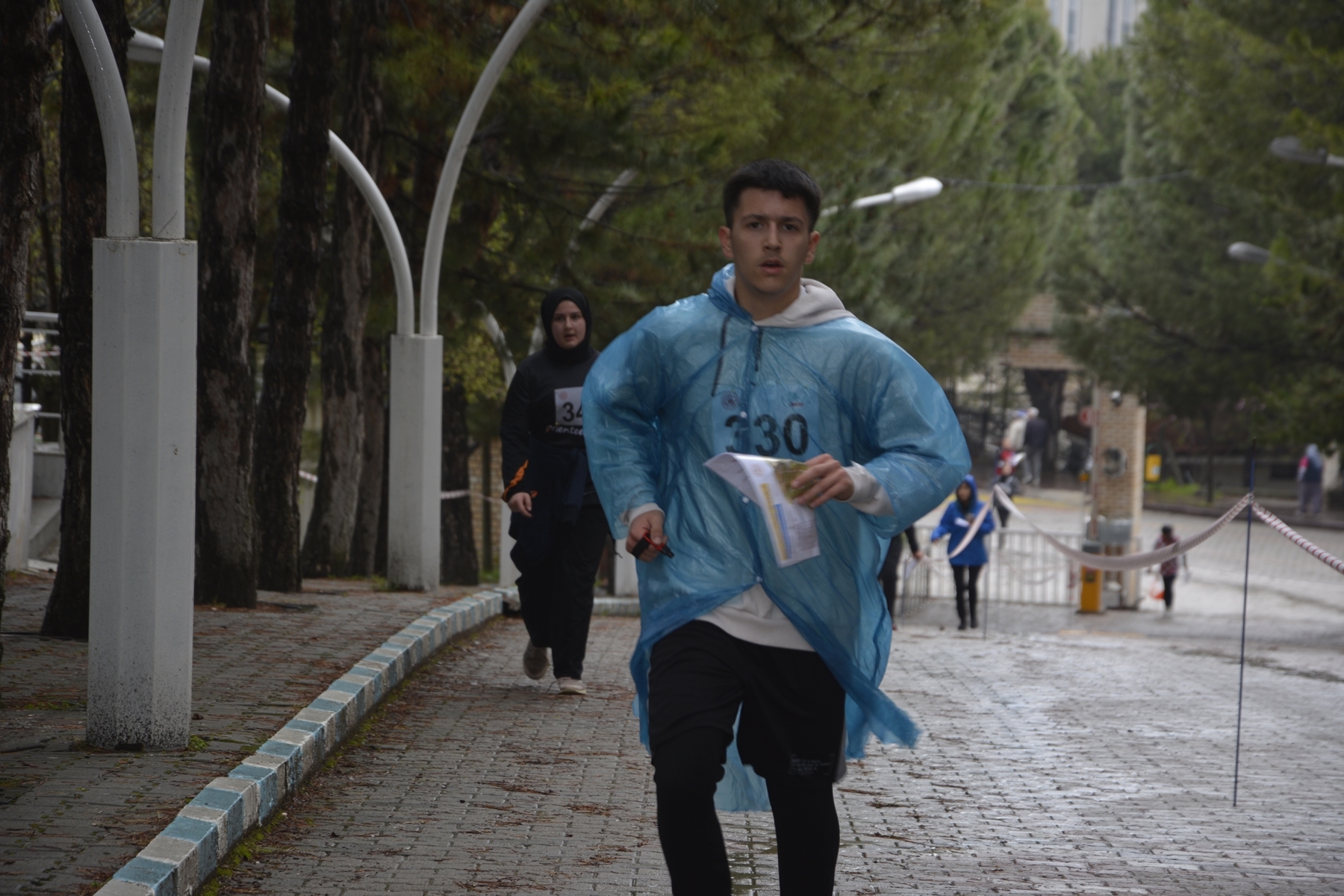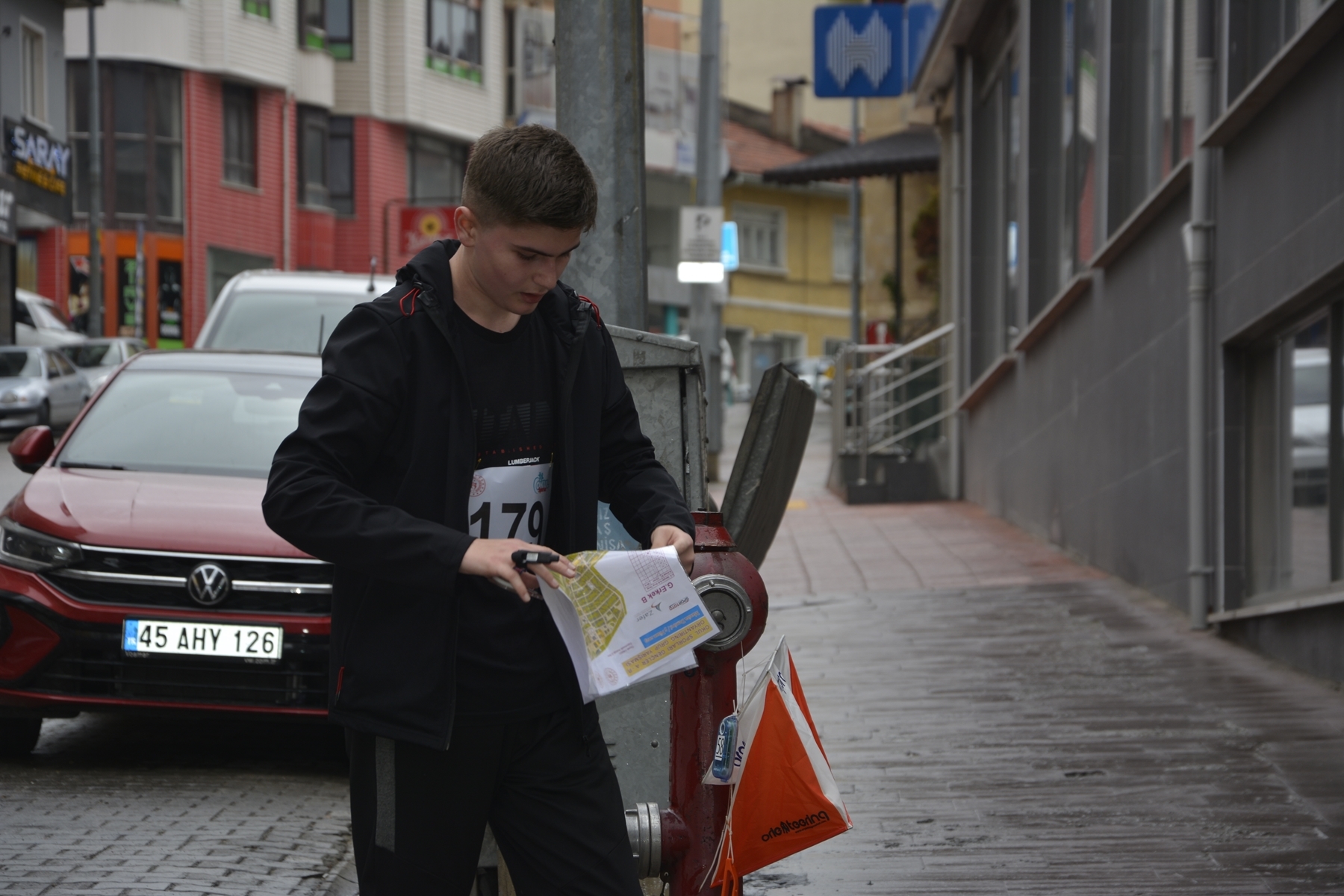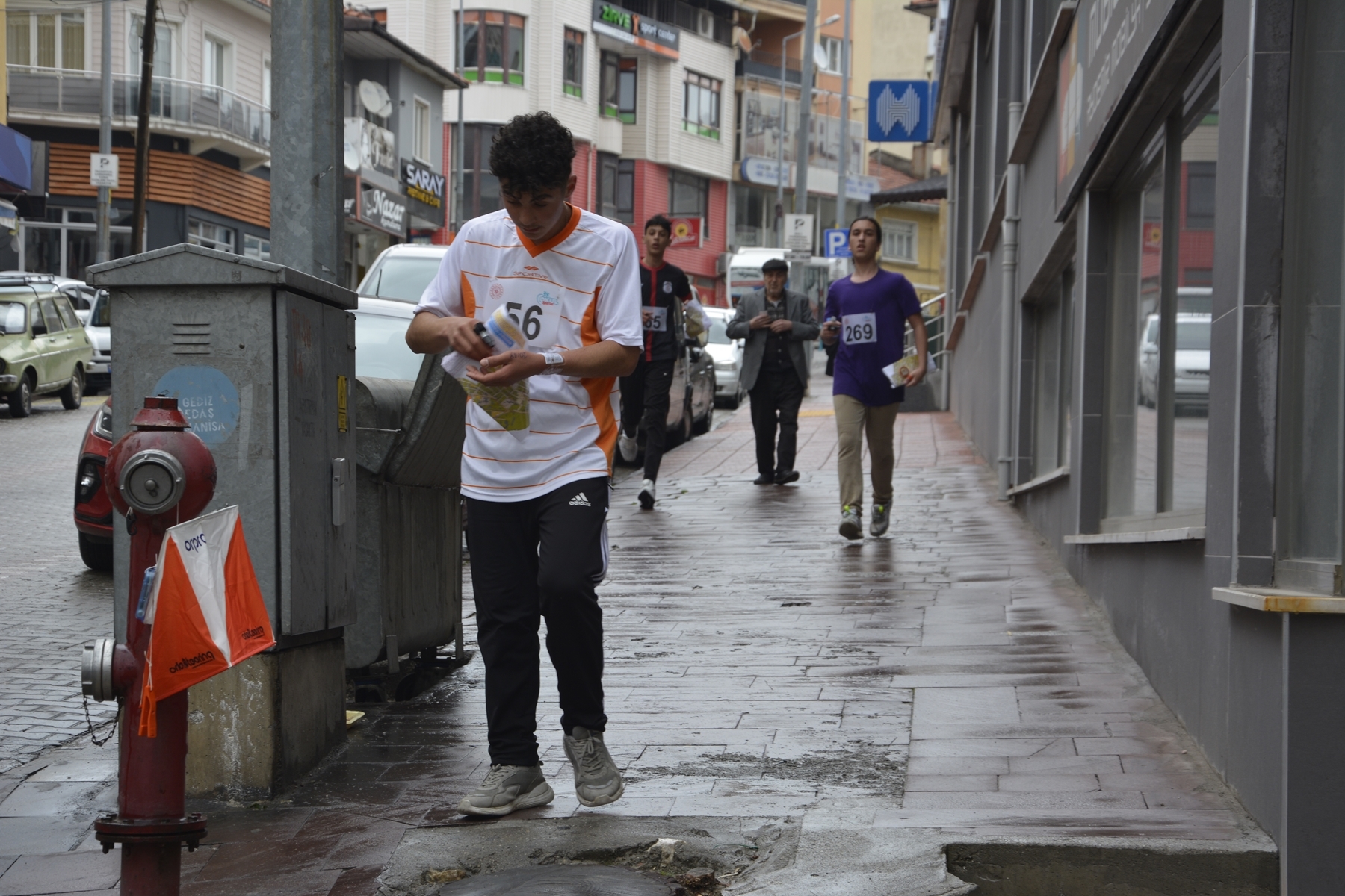Sporcular ilçe merkezinde farklı noktalardaki hedefleri tamamlayabilmek için sağanak yağmur altında yarışları tamamladılar.