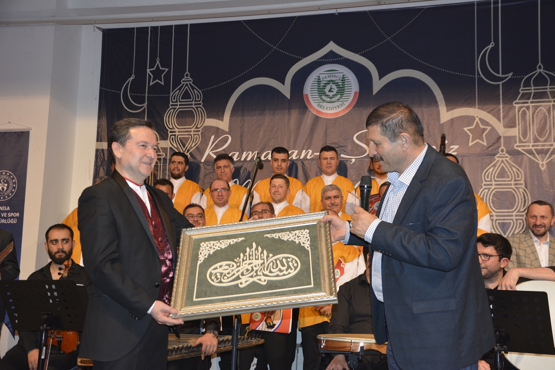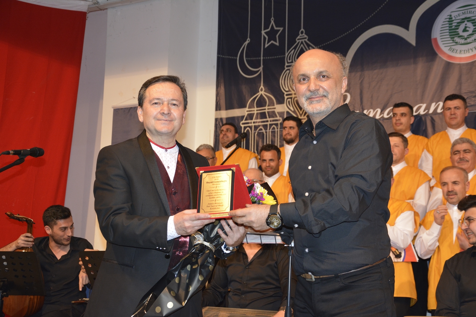 Demirci Belediye Başkanı Selami Selçuk programın sonunda koro şefi Öğr. Gör. Hayati Cezayirlioğlu'na naht tablo ve çiçek hediye ederek, koronun hazırlanmasında verdiği emekten dolayı teşekkür etti.
