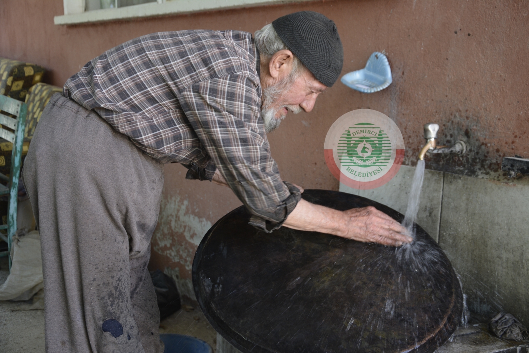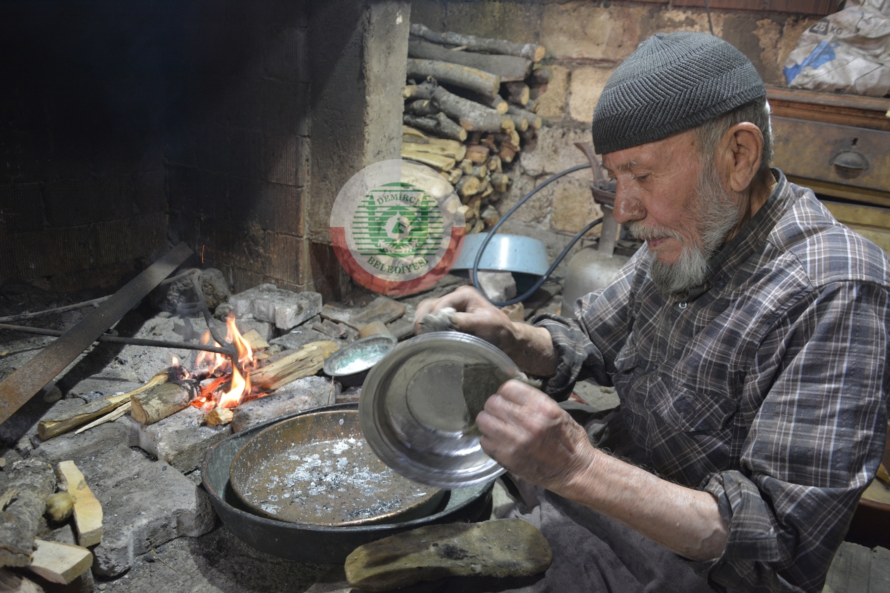 Demirci'de yaşayan 83 yaşındaki kalaycı ustası Ali Bilek, çocukken başladığı dede mesleğini 73 yıldır sürdürüyor.