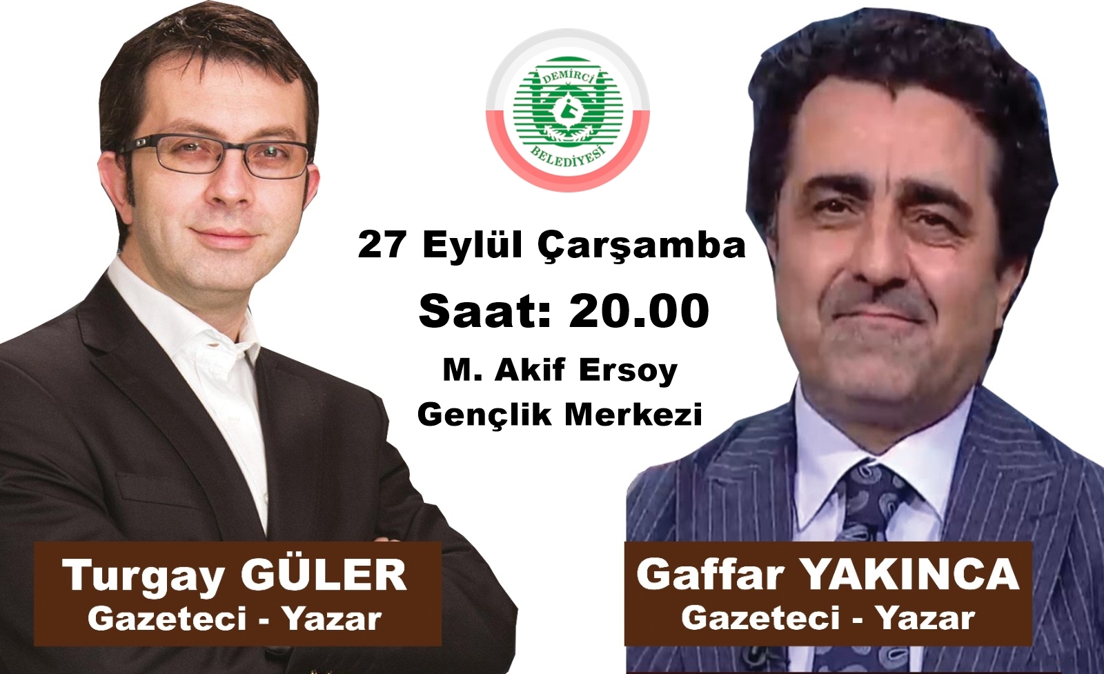 Akşam Gazetesi Yazarı, Ülke Tv Sıradışı Strateji ve En Sıradışı programlarının yapımcısı ve moderatörü Turgay Güler, Aydınlık Gazetesi, Aydınlık Gazetesi Yazarı, A Haber ve CNN TÜRK yorumcusu Gaffar Yakınca Demirci'de konferans verecek.