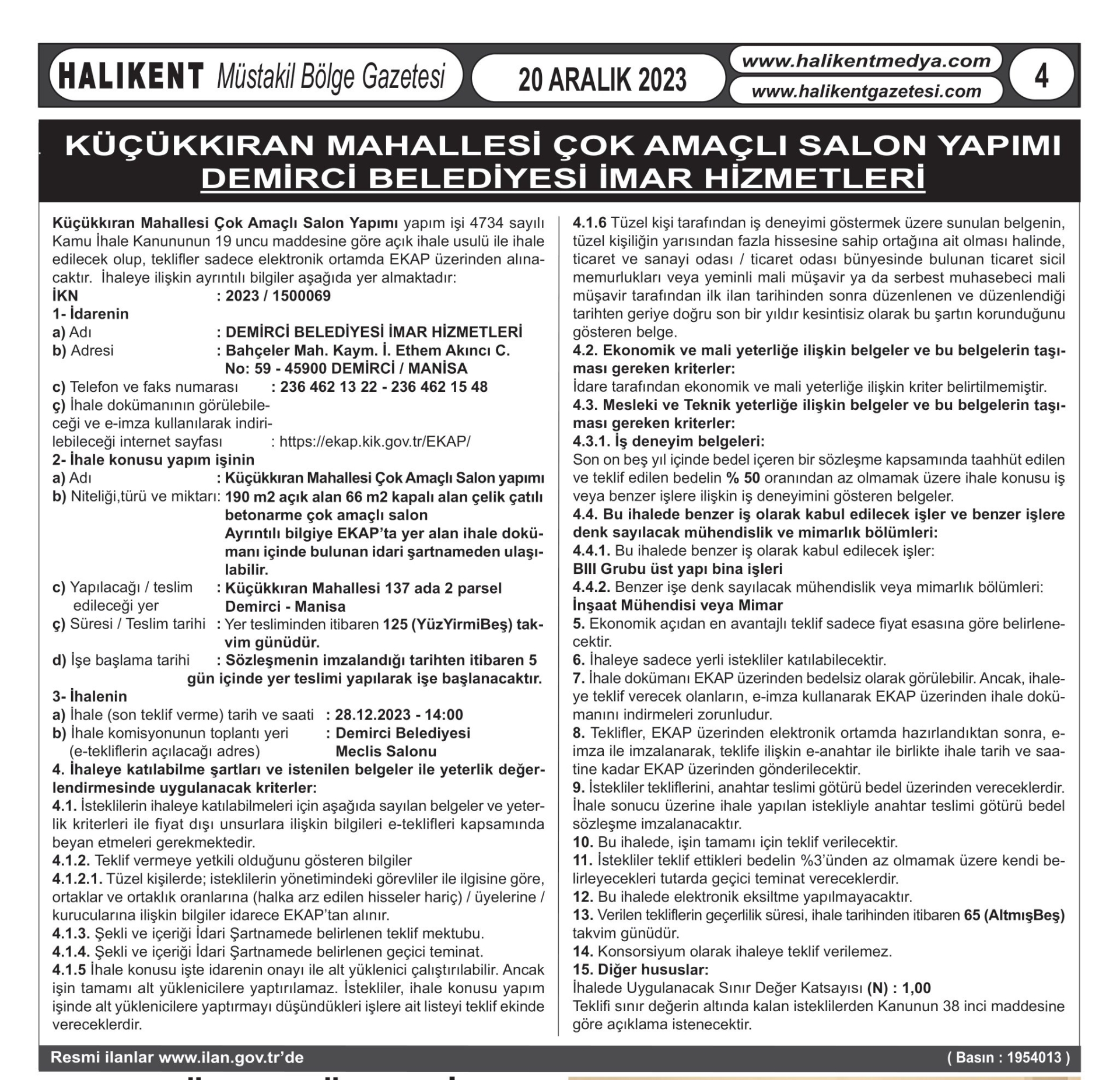 256 metrekare büyüklüğünde 60 metrekaresi kapalı, 190 metrekaresi yarı açık olarak yapılacak olan Küçükkıran mahallesi çok amaçlı salonun inşaat ihalesi 28 Aralık 2023 / Perşembe günü saat: 14.00'da yapılacak.
