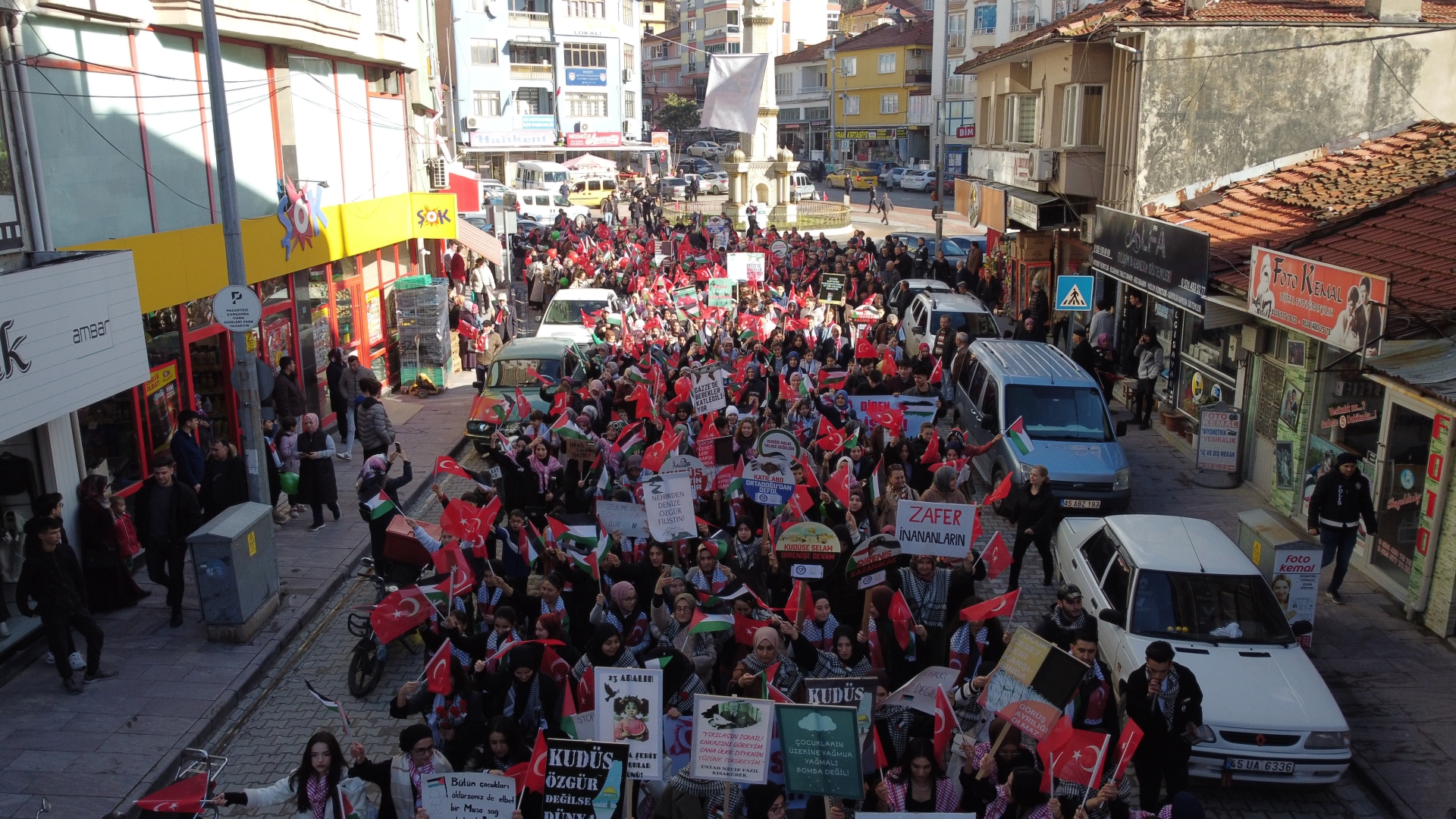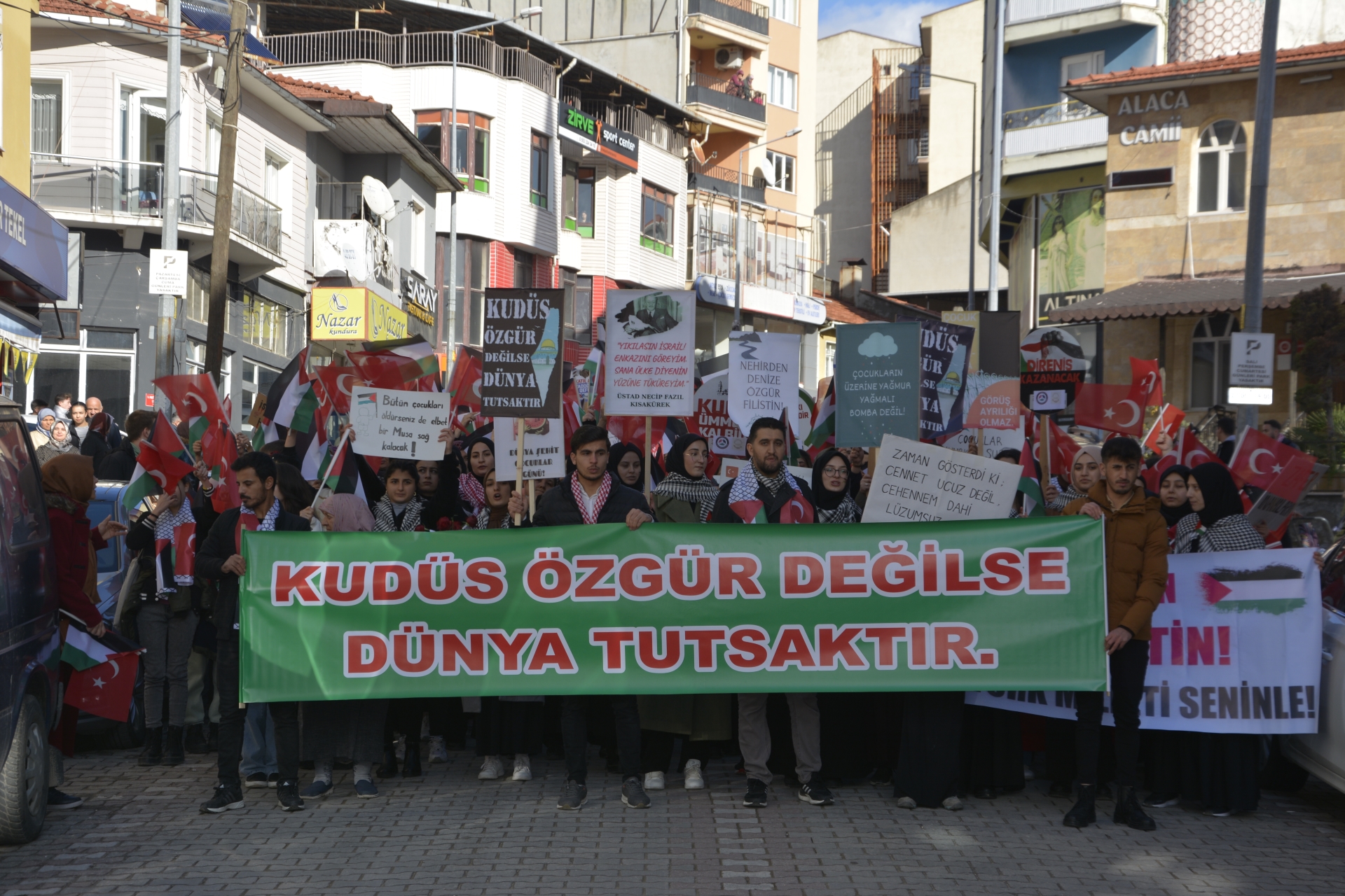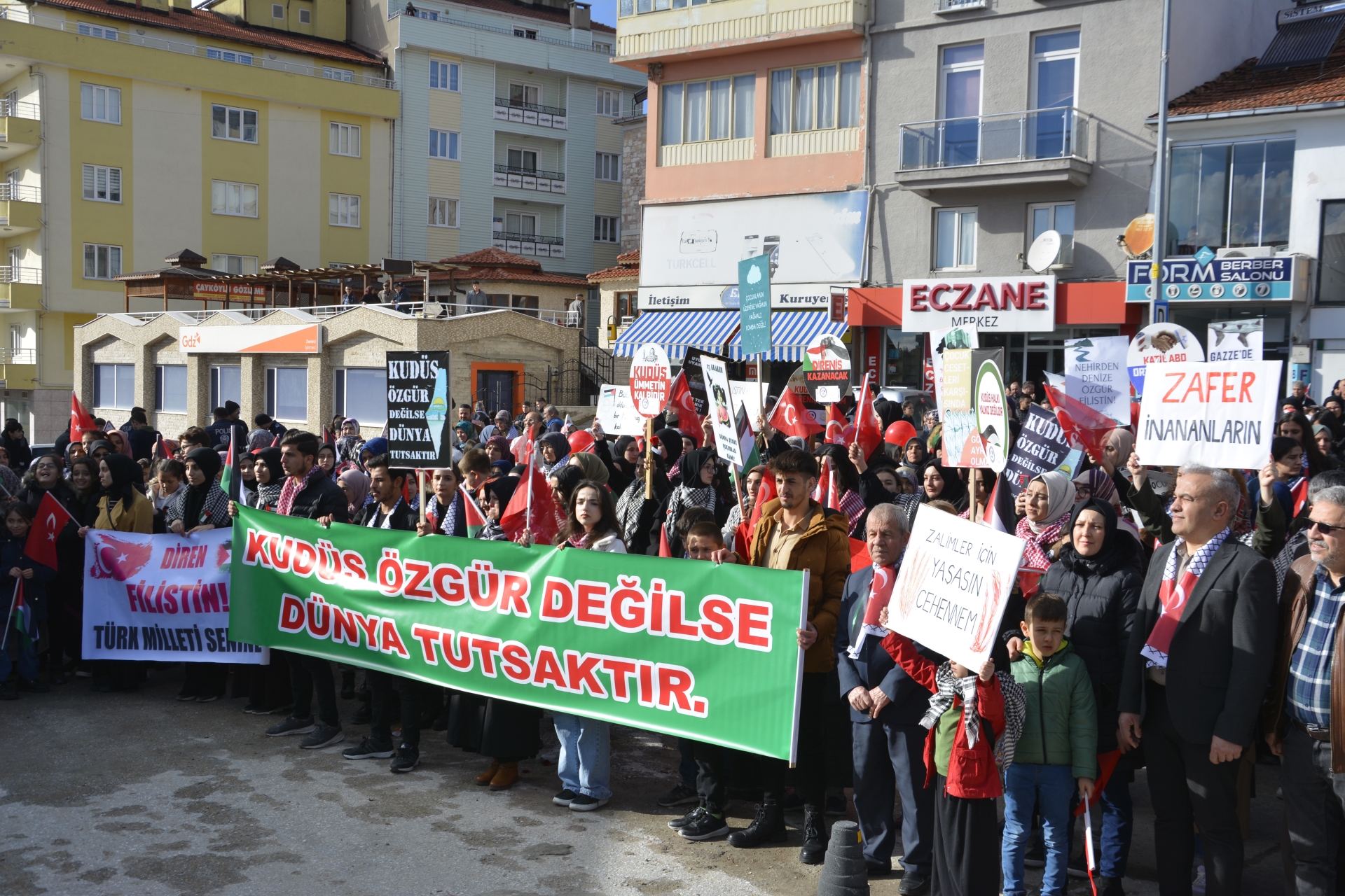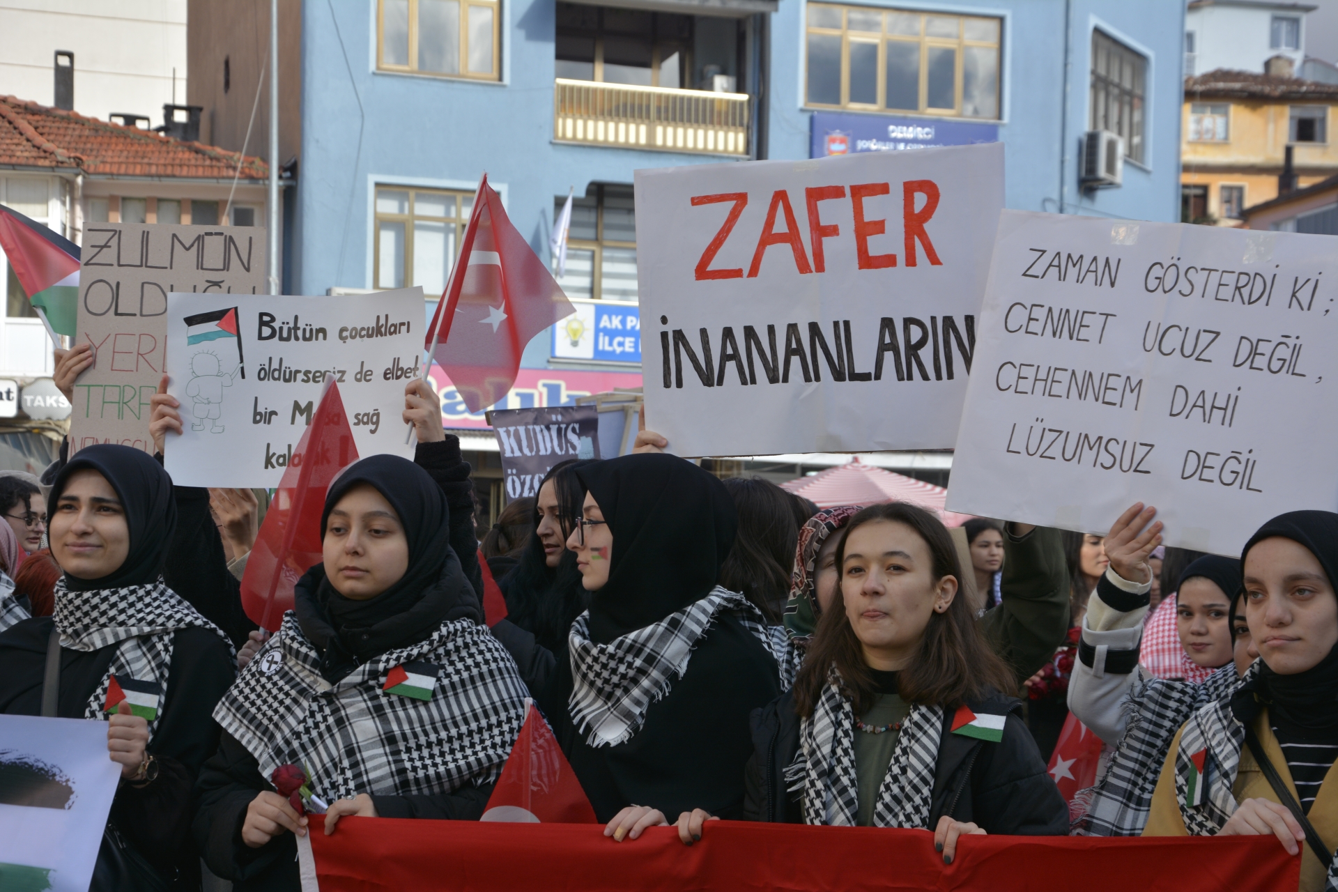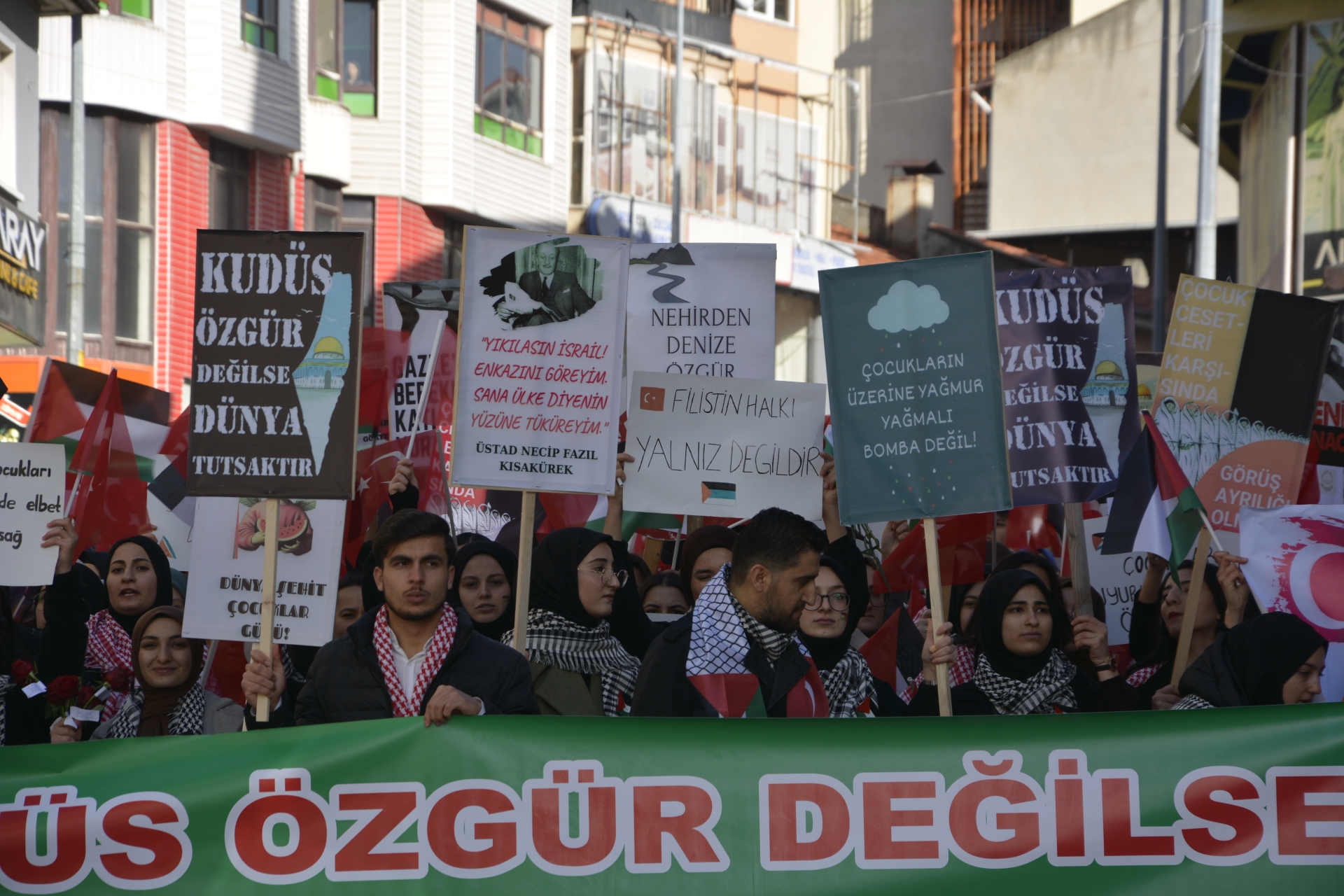 Yürüyüşte “ Katil İsrail “ sloganları ve tekbirler getirilirken, gençlerde “ Diren Filistin Türk Milleti Seninle “ , “ Zafer İnananlarındır “ dövizleri ile İsrail’in zulmüne tepki gösterdiler.