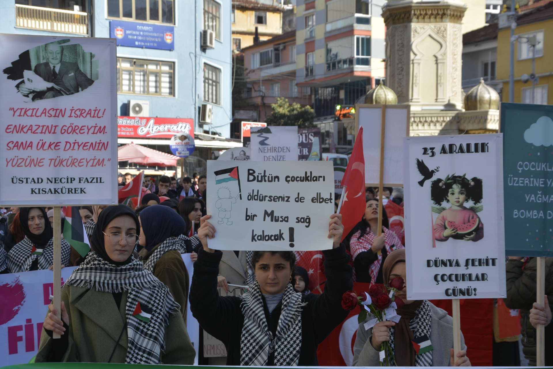 Demirci'de binlerce kişi 23 Aralık Dünya Şehit Çocuklar gününde Filistin’e Özgürlük yürüyüşü yaparken, vefat eden Müslümanlar ve Pençe kilit harekatında Şehit olan Mehmetçiklerimiz için dua edildi.
