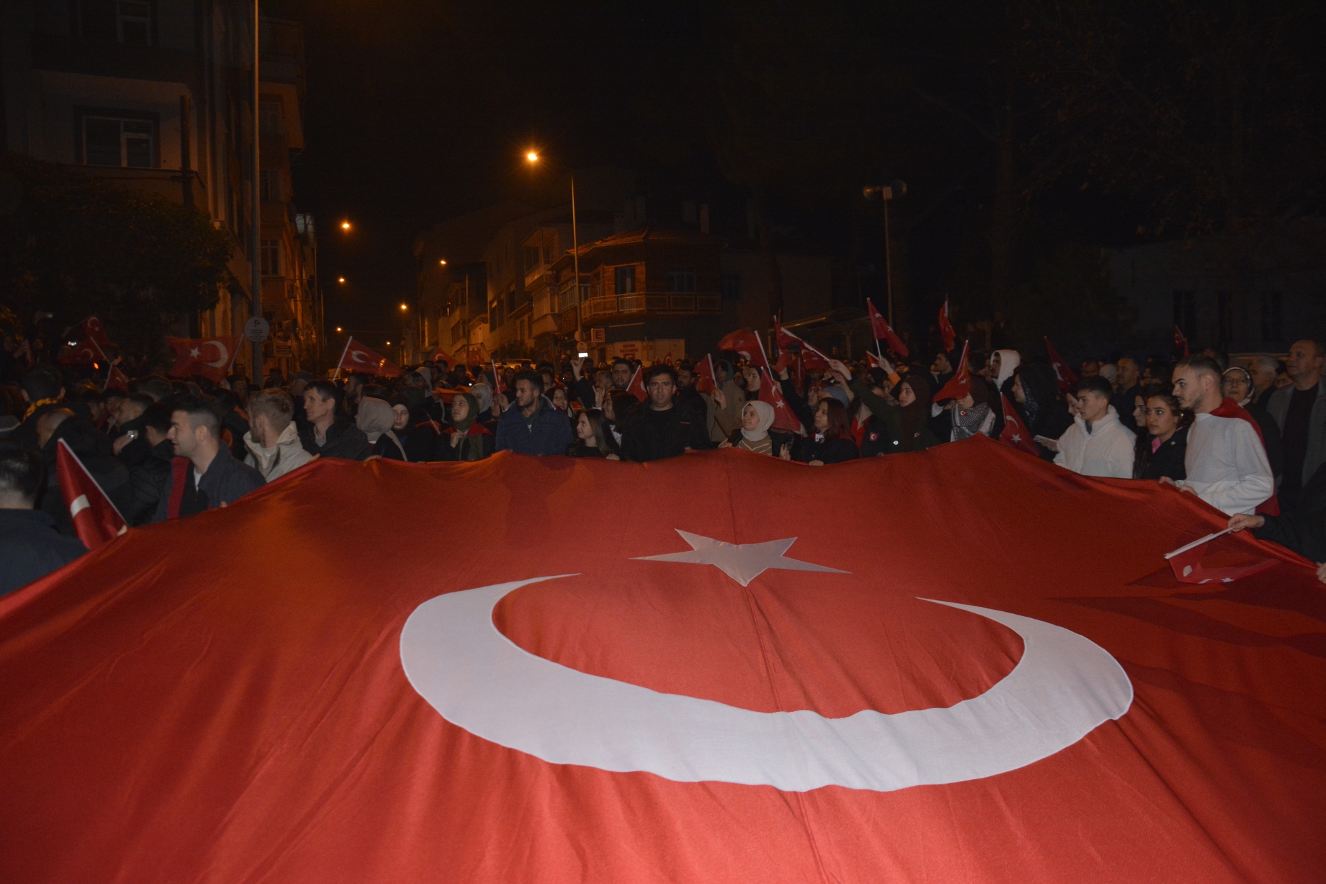 "Şehitler ölmez, vatan bölünmez" şeklinde slogan atan öğrenciler, tekbirlerle çereşe meydanından Atatürk anıtına kadar yürüdü.
