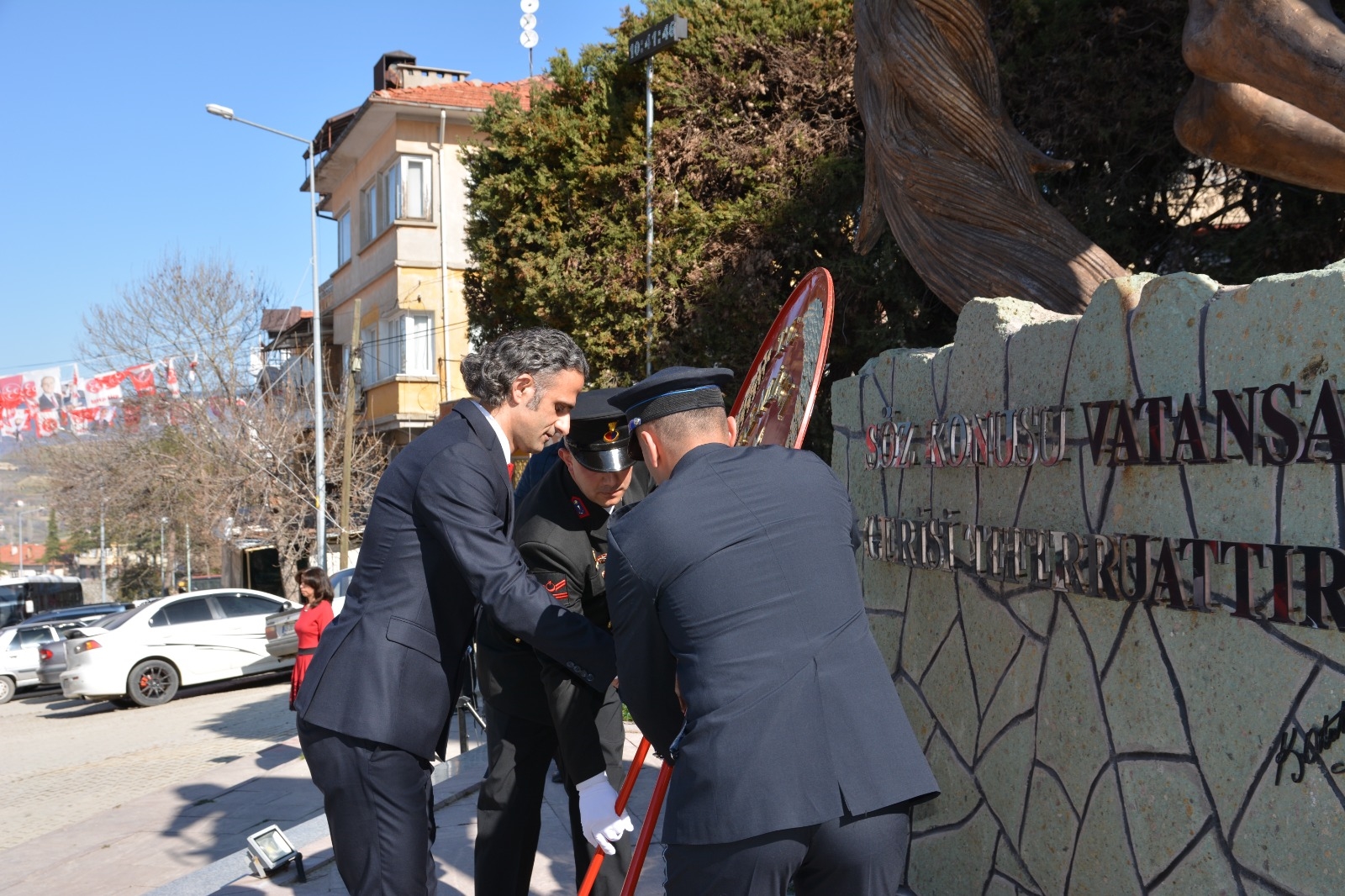 Anıta çelenklerin konulmasının ardından, Saygı Duruşu ve akabinde İstiklal Marşı eşliğinde Türk bayrağı göndere çekildi.
