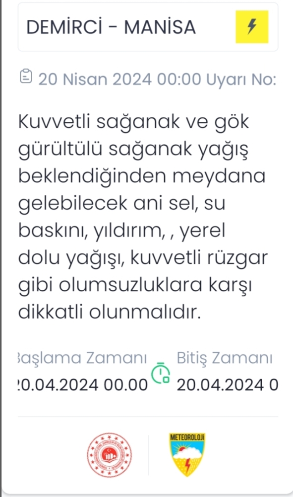 Demirci ilçe merkezi ve bölgesinde 20 Nisan Cumartesi sabah saatlerinden itibaren gökgürültülü sağanak yağış beklendiğinden meydana gelebilecek ani sel, su baskını, yıldırım, yerel dolu yağışı, kuvvetli rüzgar gibi olumsuzluklara karşı dikkatli olunmalıdır.
