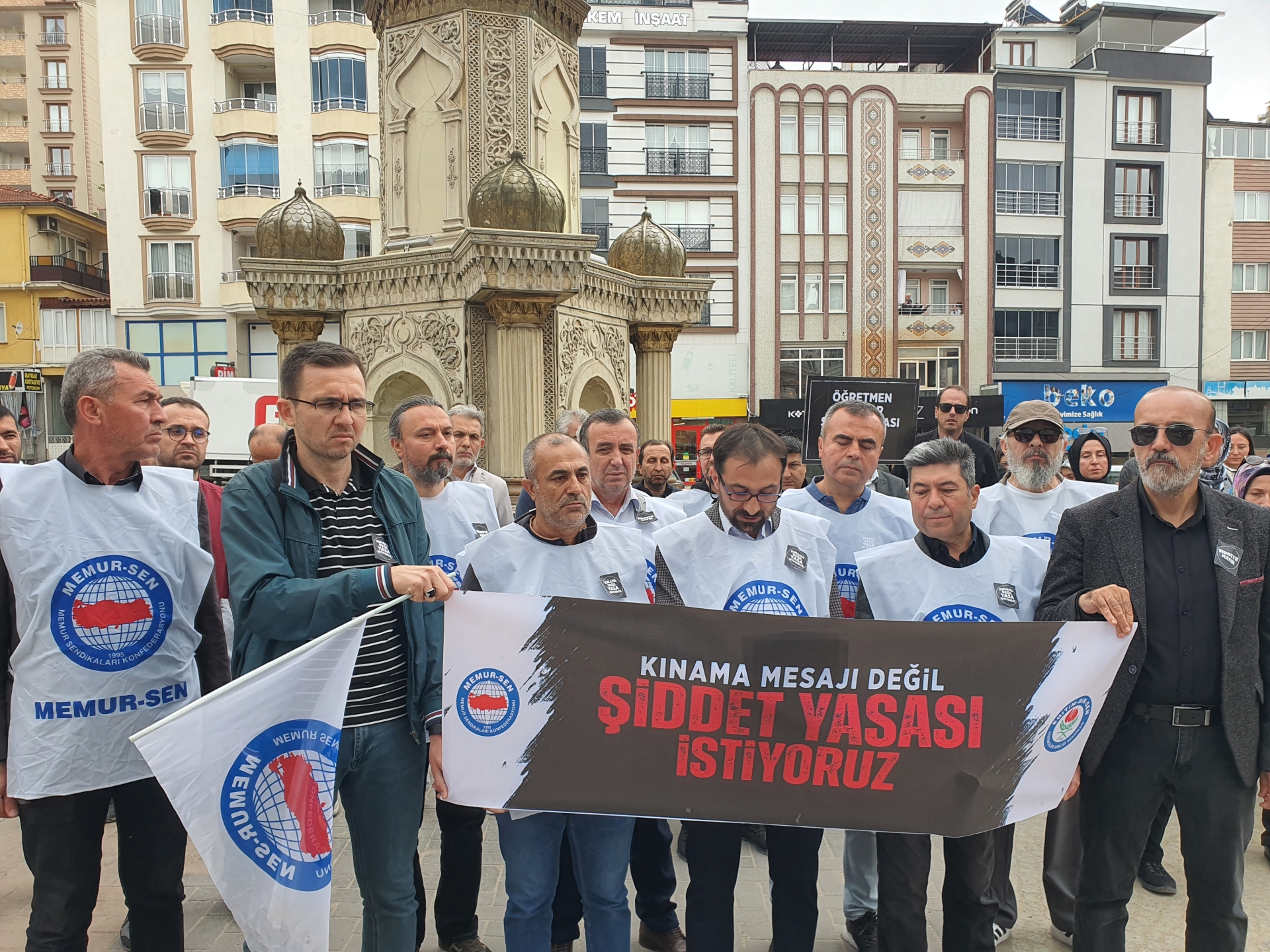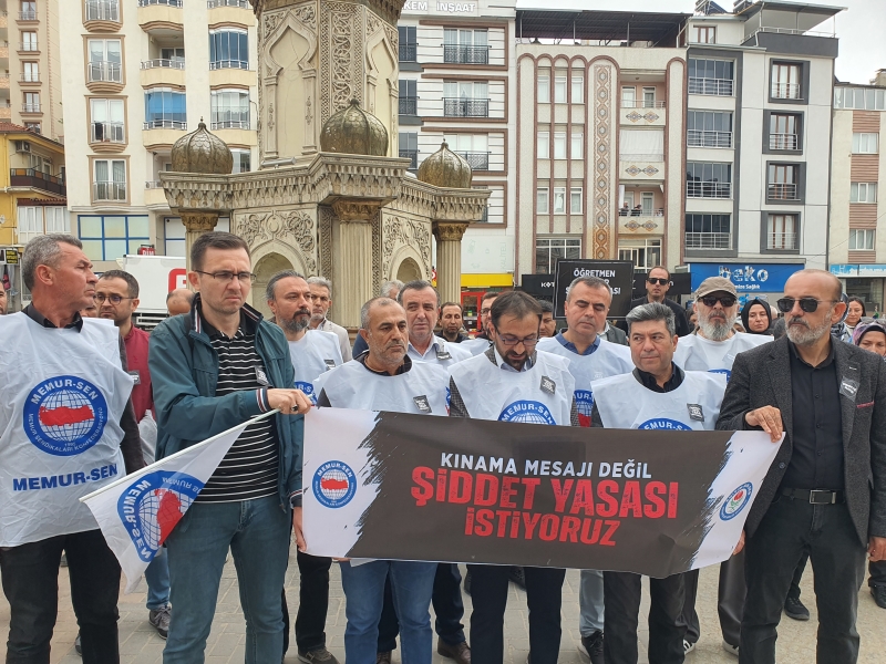 Eğitim-Bir-Sen İlçe Temsilcisi Mehmet Dağlar yaptığı açıklamada “ Eğitim çalışanlarına yönelik giderek artan şiddet olaylarını protesto etmek amacı ve şiddeti önleyecek, failleri cezalandıracak, mağdurlara hukuki koruma sağlayacak bir yasal düzenlemenin yapılması talebiyle bir araya gelmiş bulunmaktayız.