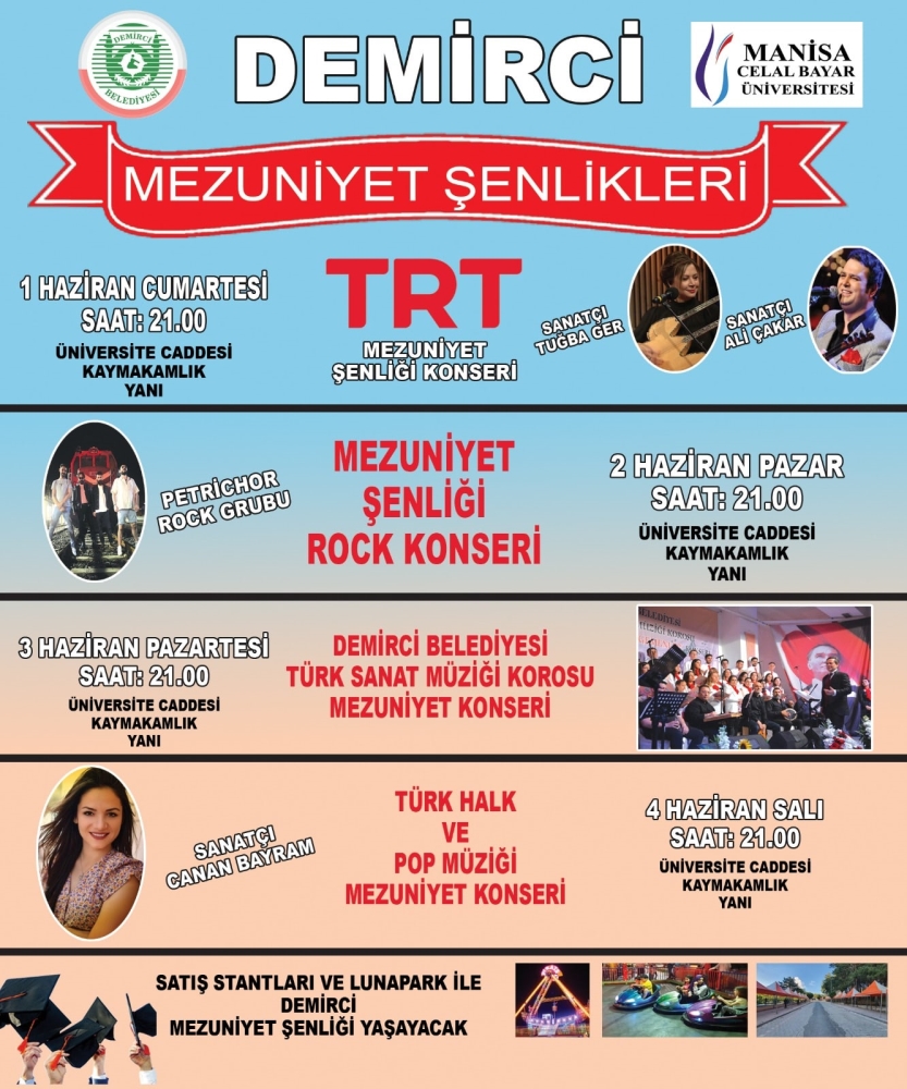 Demirci Kaymakamlığı koordinasyonunda Demirci Belediyesinin destekleri ile yapılacak olan Eğitim Fakültesi ve Meslek Yüksekokulu mezuniyet şenlikleri 31 Mayıs 2024 / Cuma günü başlayacak.