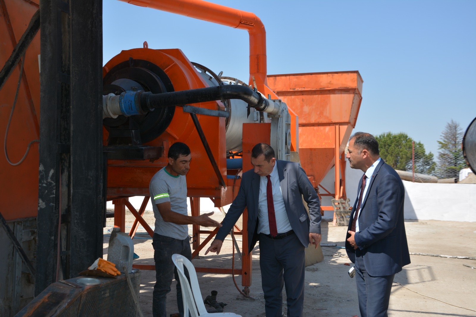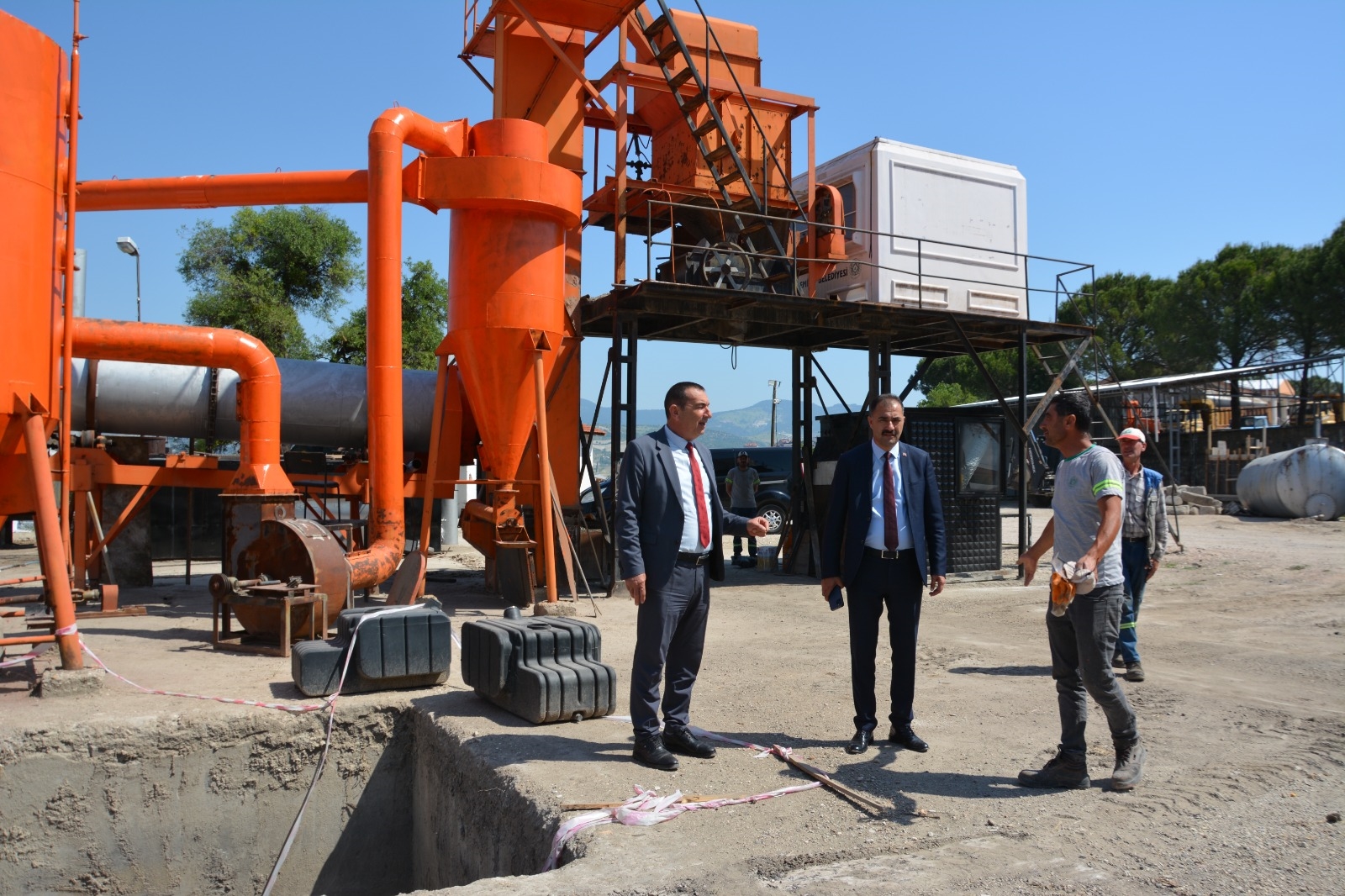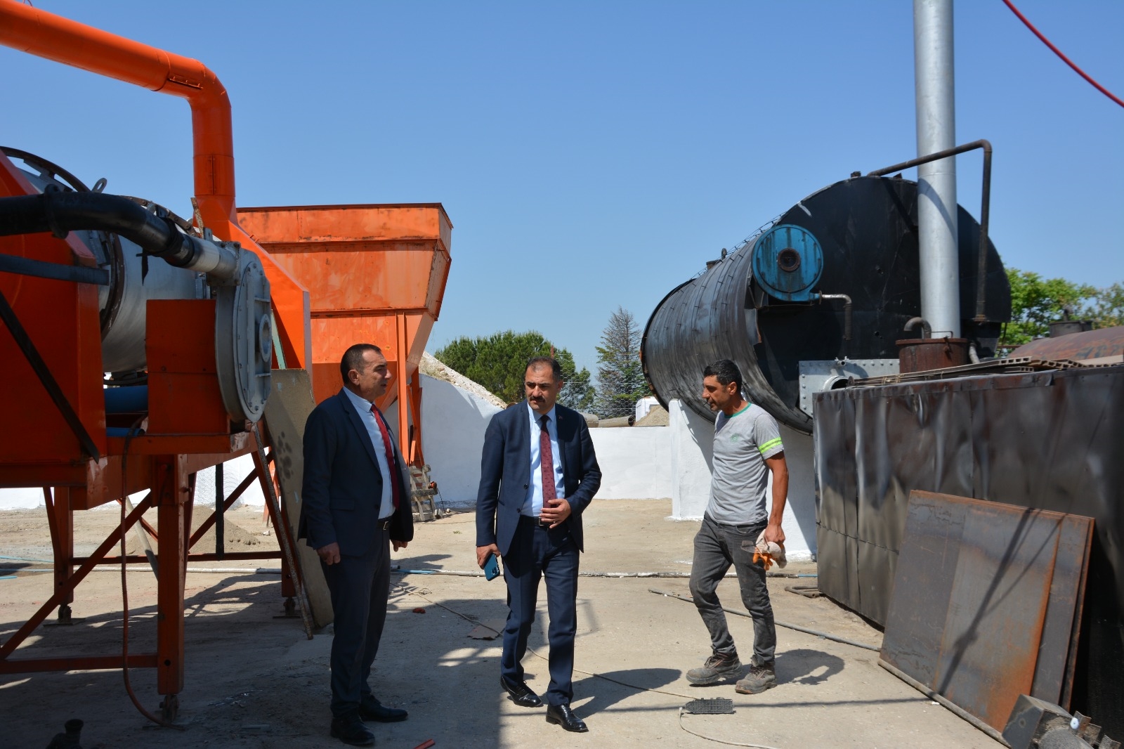 Sıcak asfalt ve soğuk asfalt üretilebilme kapasitesine sahip asfalt plentini ve çalışmaları yerinde inceleyen Belediye Başkanı Erkan Kara ve Başkan Yardımcısı İsmail Hakkı Gül, fen işleri ekiplerinden bilgi aldılar.