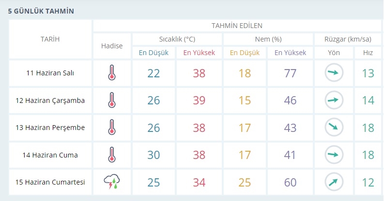 Yapılan son meteorolojik değerlendirmelere göre; 11.06.2024 Salı gününden itibaren hava sıcaklıklarının batı kesimlerden başlayarak daha da artacağı, Çarşamba, Perşembe ve Cuma günleri Marmara, Ege, Akdeniz, İç Anadolu ile Batı ve Orta Karadeniz’in iç kesimlerinde mevsim normallerinin 8 ila 12 °C üzerinde, diğer bölgelerde mevsim normallerinin 4 ila 8 °C üzerinde seyredeceği tahmin ediliyor.