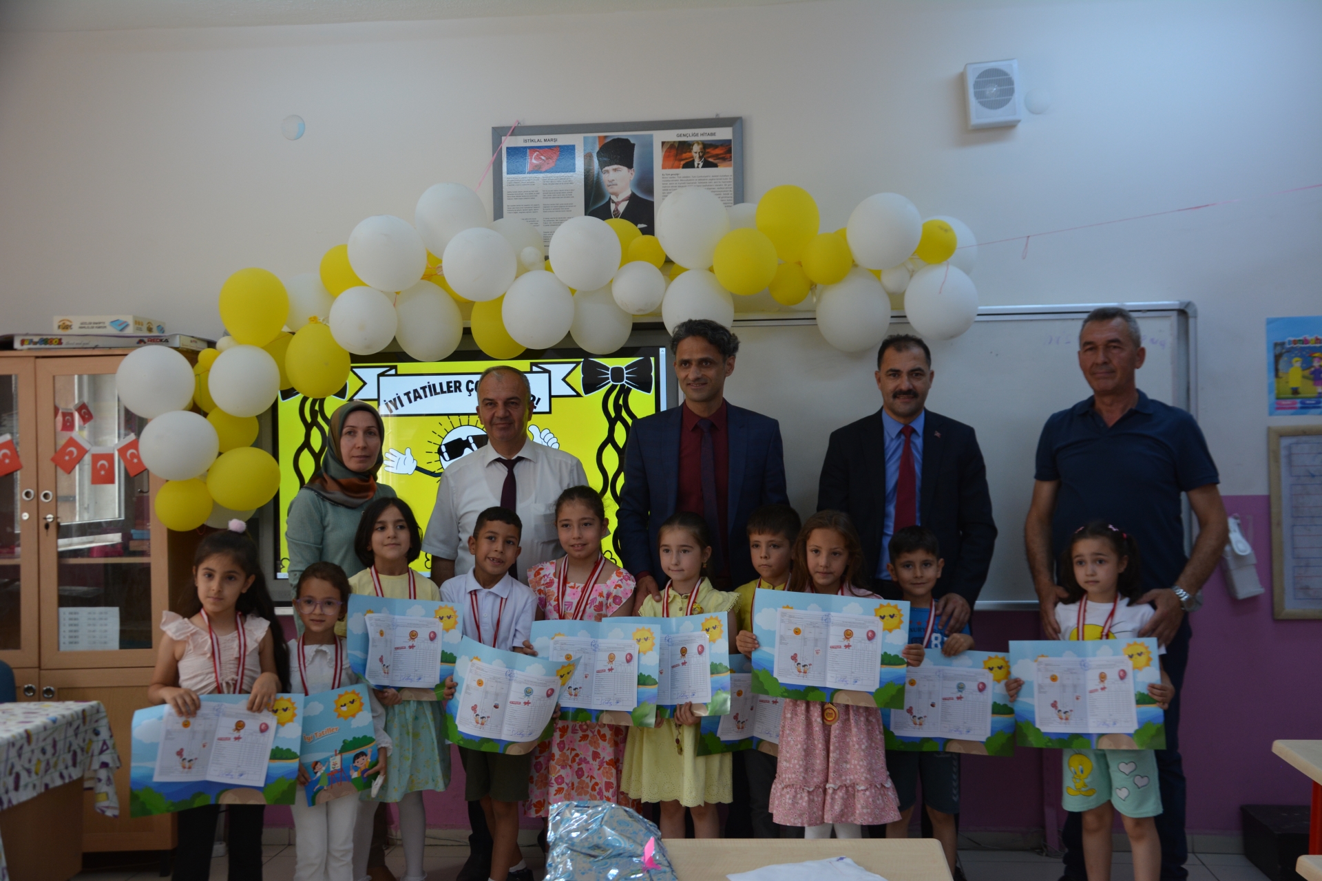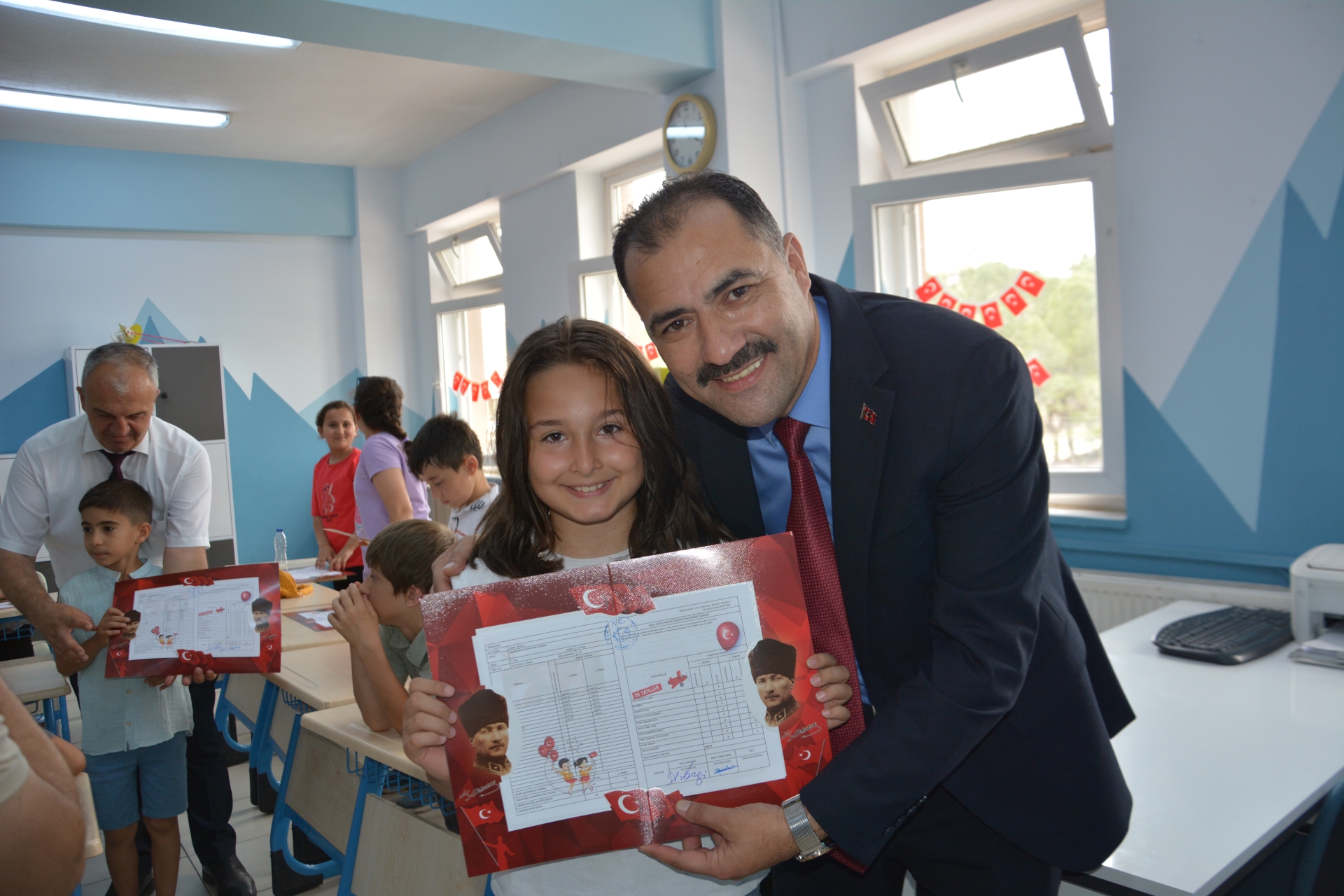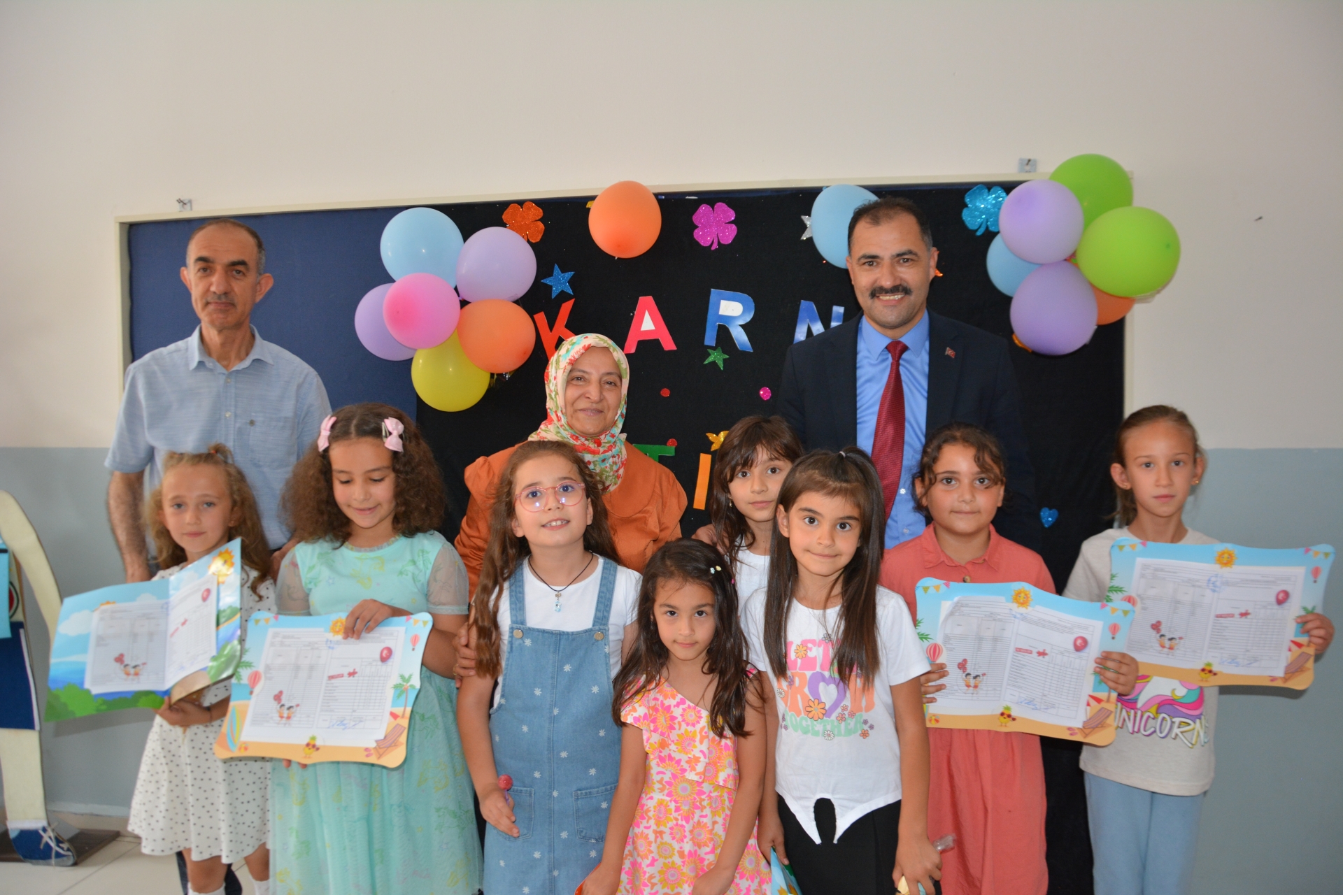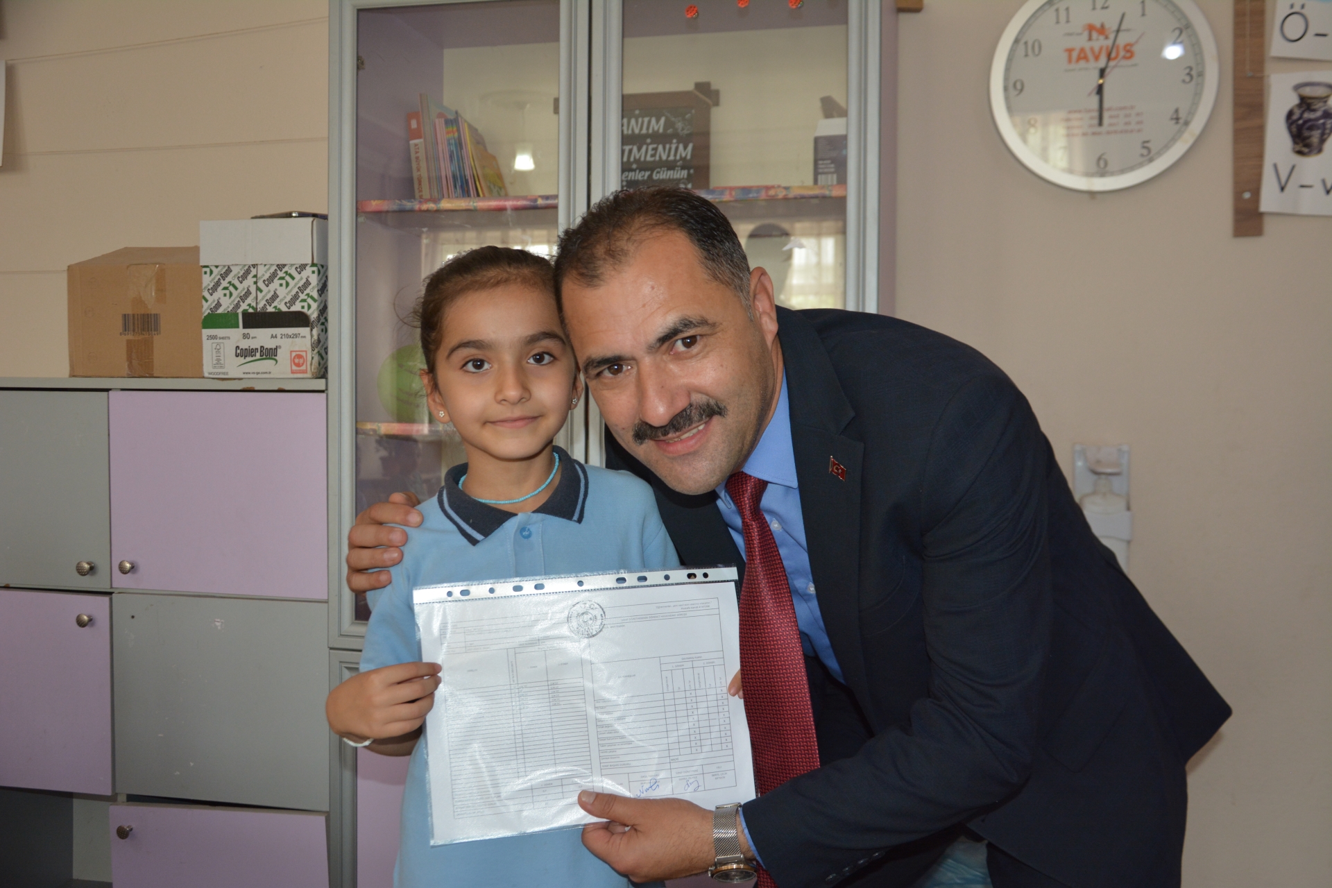 Kaymakam Adem Kaya, Başkan Erkan Kara ve Milli Eğitim Müdürü Bilal Çetinkaya, Hikmet Arsal Anaokulu, Cumhuriyet İlkokulu, Atatürk İlkokulu, Fatih Ortaokulu ve İmam Hatip Ortaokulunda öğrencilere karnelerini takdim ettiler.