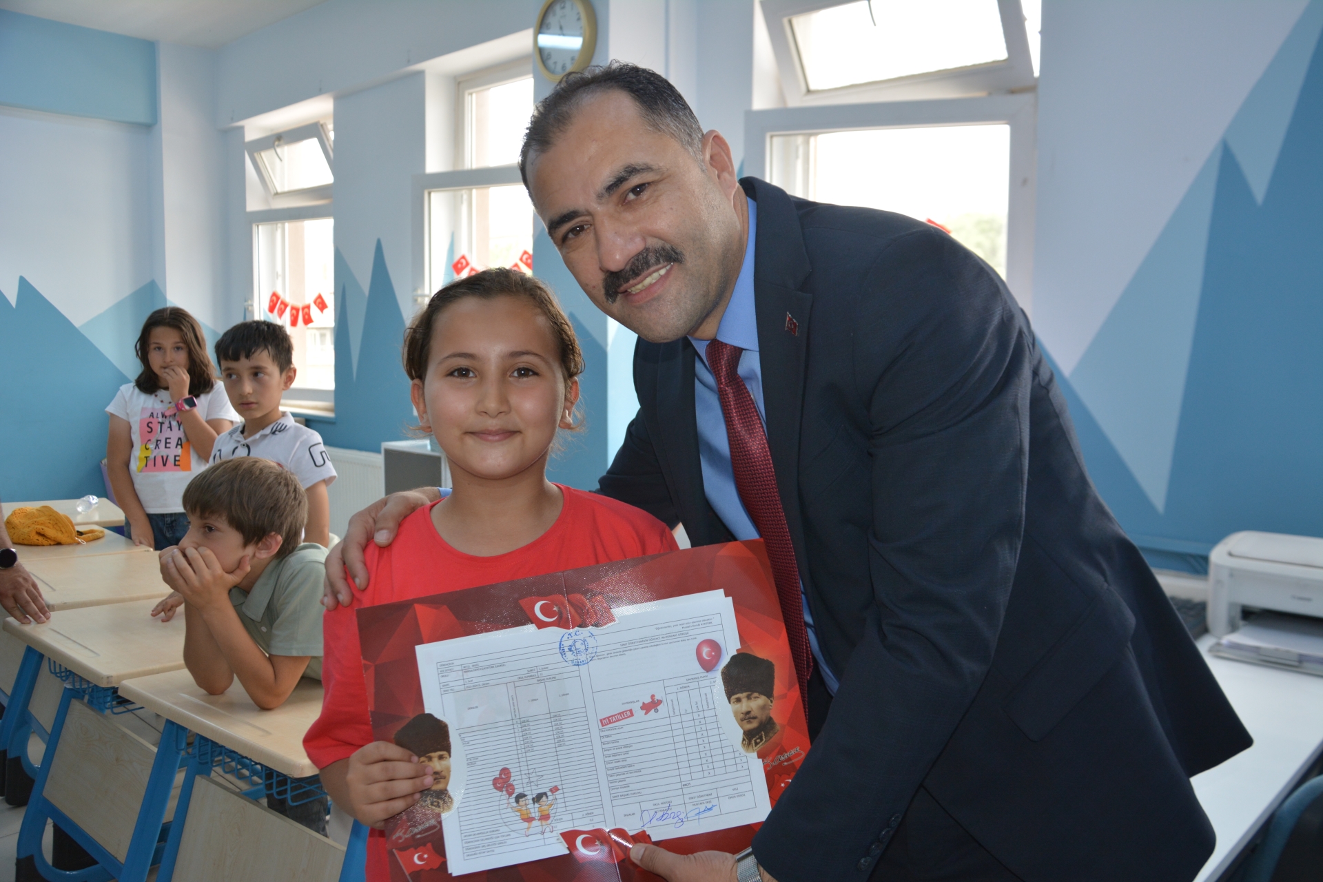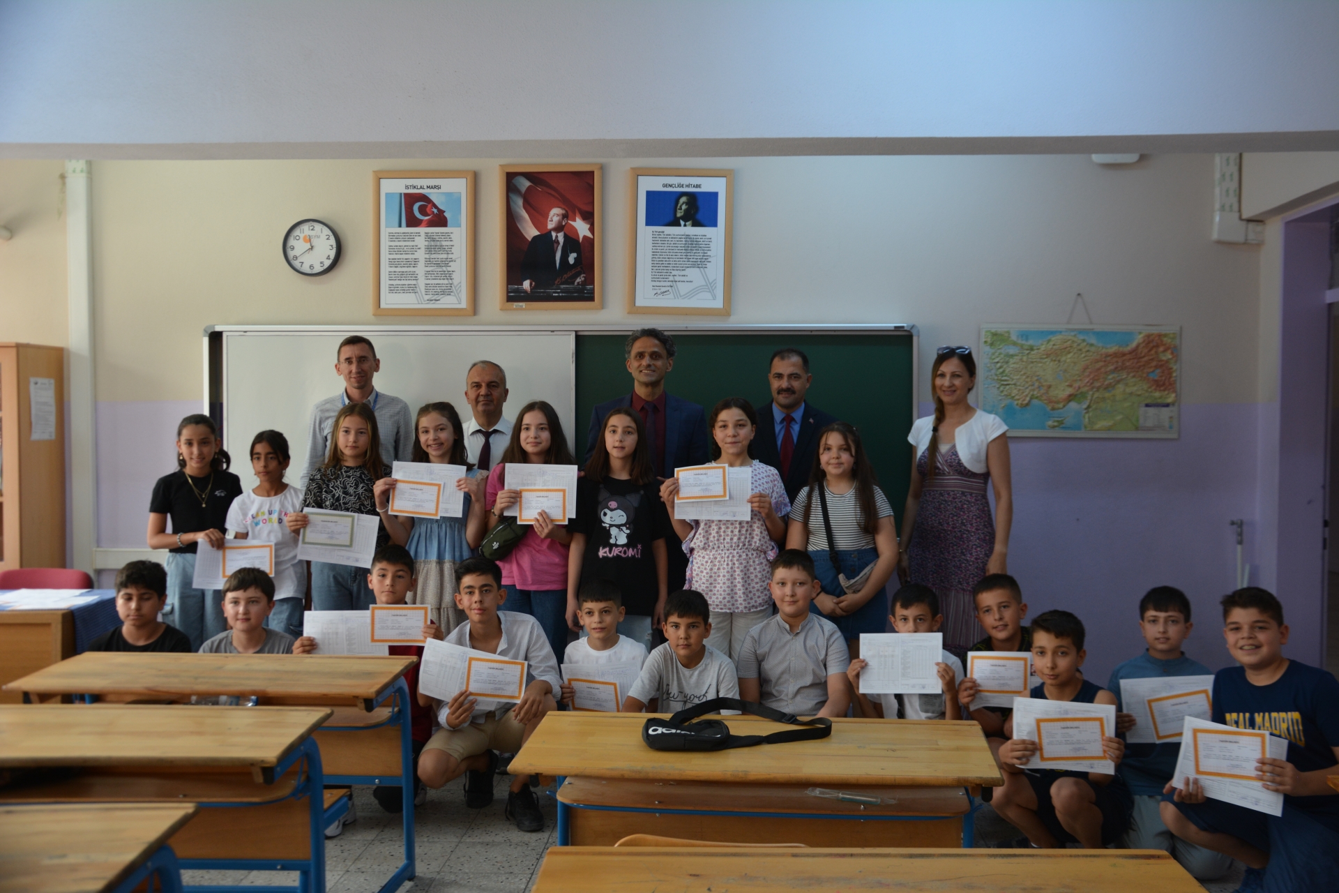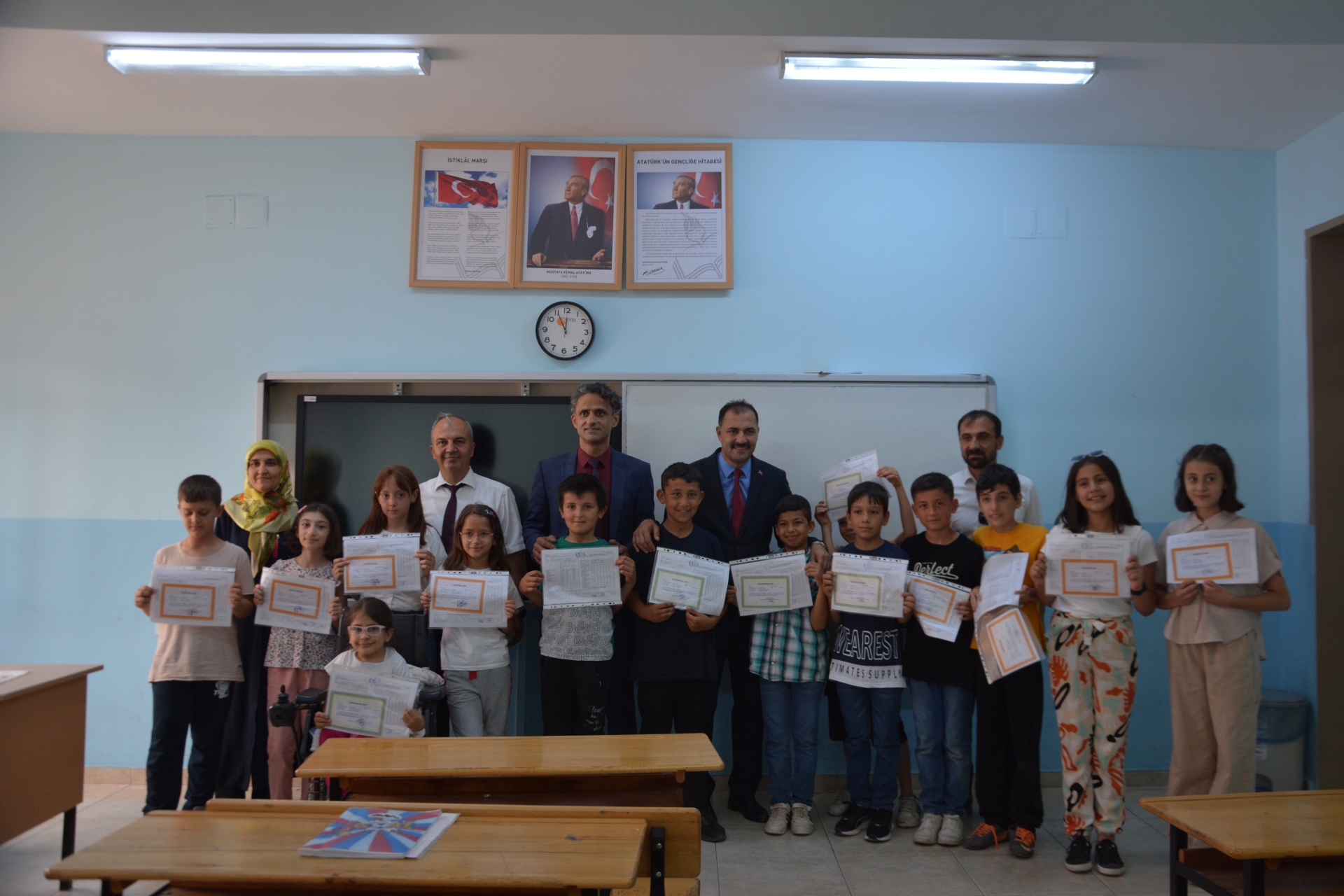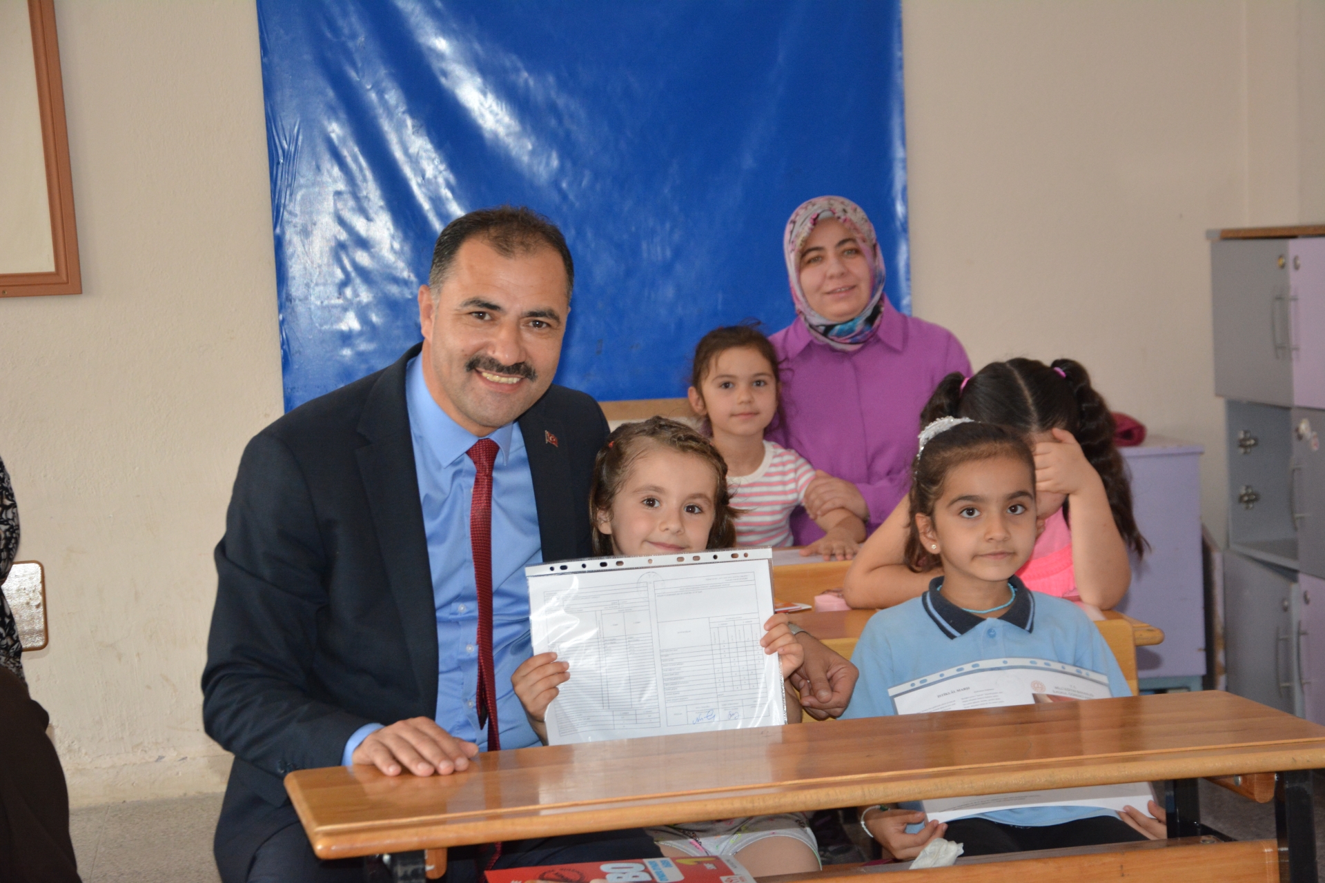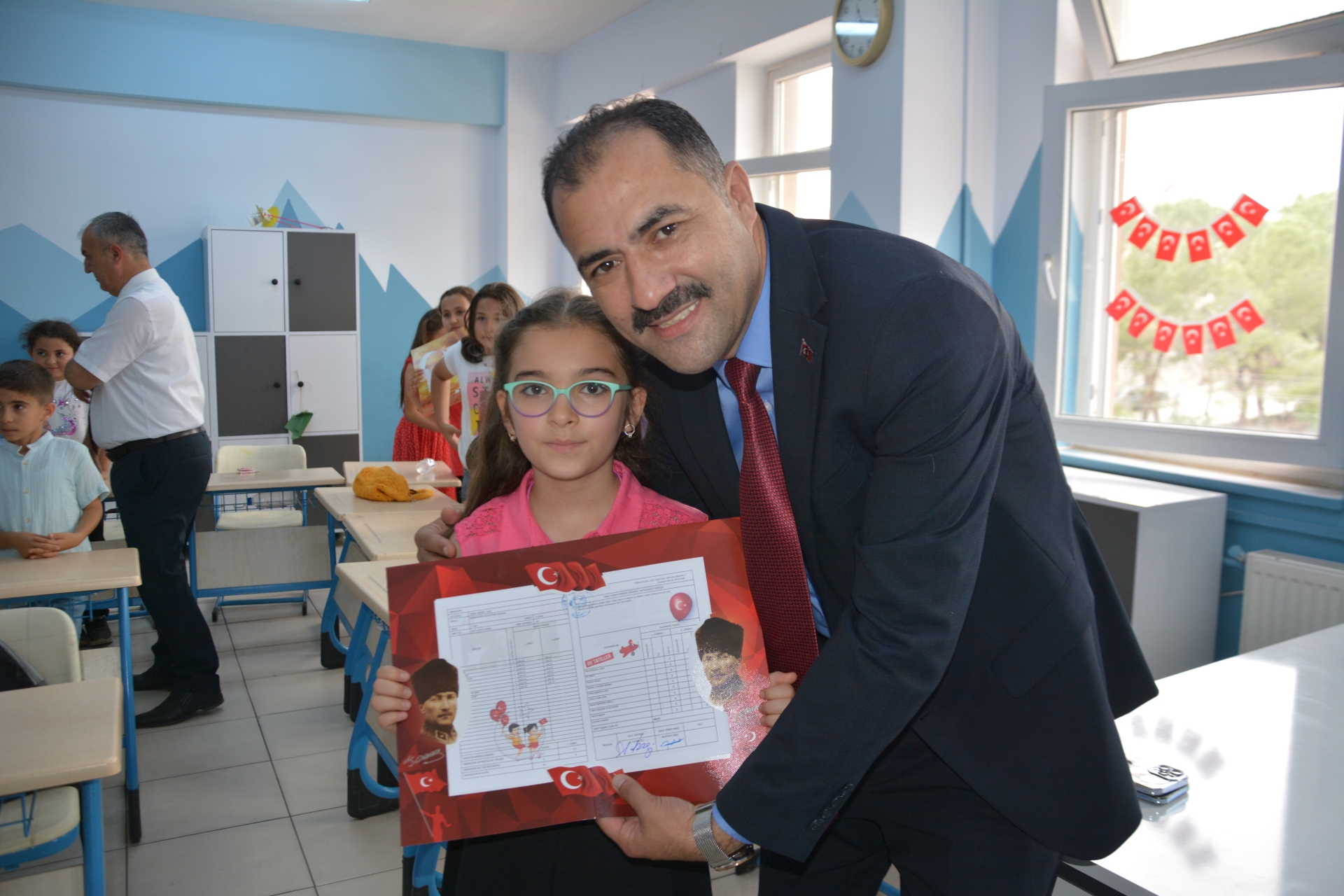 Kaymakam Adem Kaya, Başkan Erkan Kara ve Milli Eğitim Müdürü Bilal Çetinkaya, Hikmet Arsal Anaokulu, Cumhuriyet İlkokulu, Atatürk İlkokulu, Fatih Ortaokulu ve İmam Hatip Ortaokulunda öğrencilere karnelerini takdim ettiler.