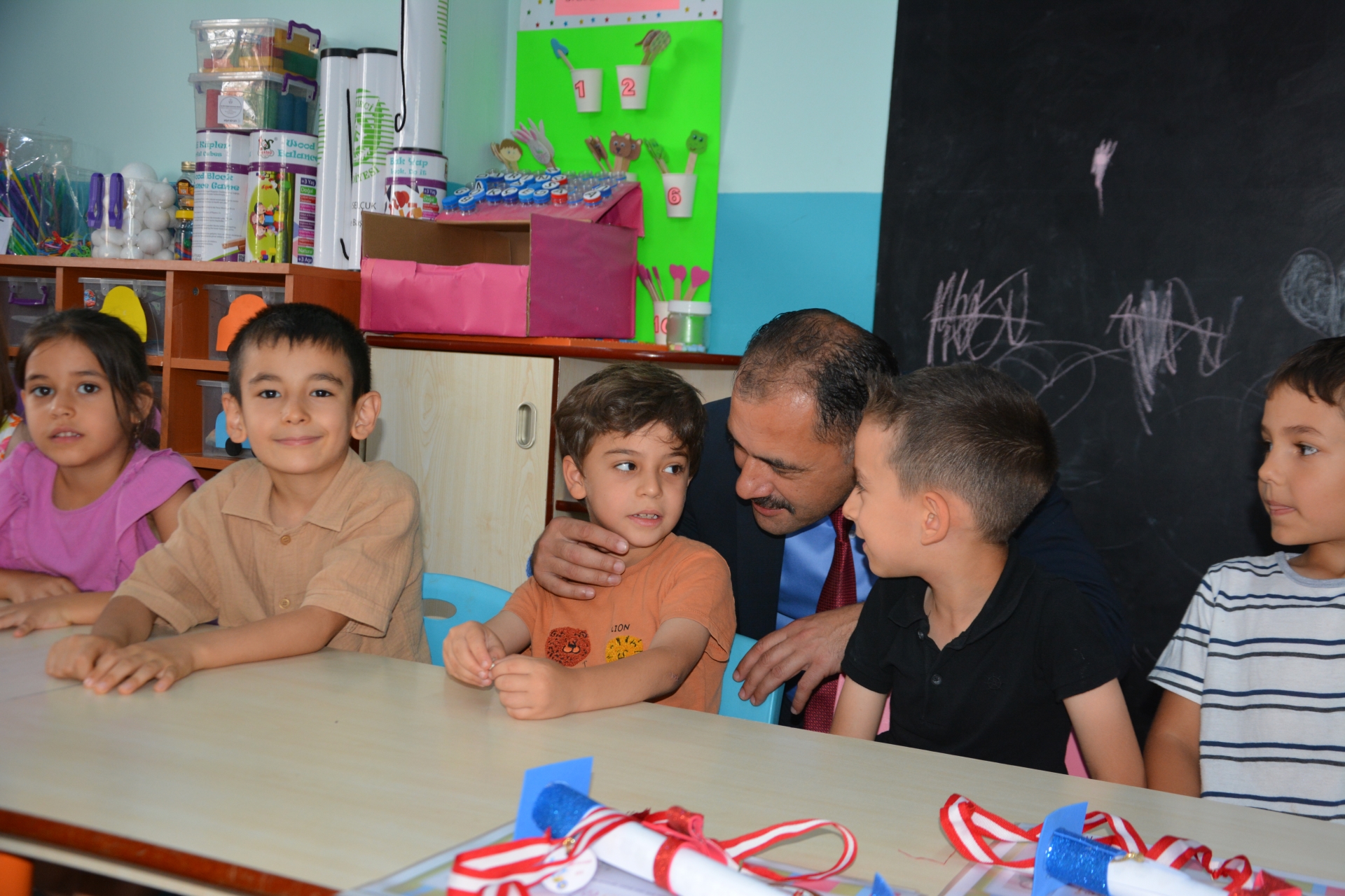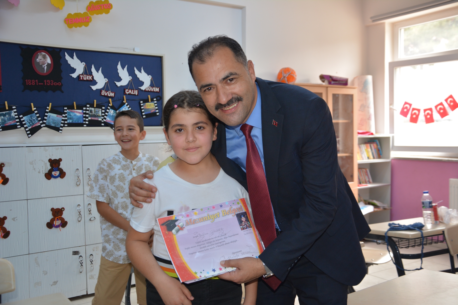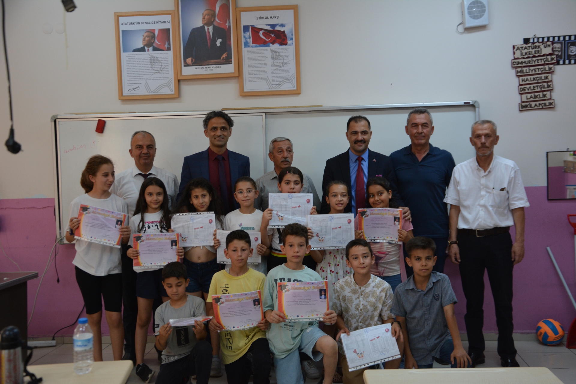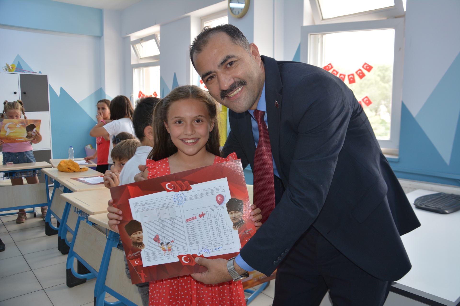 Kaymakam Adem Kaya, Başkan Erkan Kara ve Milli Eğitim Müdürü Bilal Çetinkaya, Hikmet Arsal Anaokulu, Cumhuriyet İlkokulu, Atatürk İlkokulu, Fatih Ortaokulu ve İmam Hatip Ortaokulunda öğrencilere karnelerini takdim ettiler.