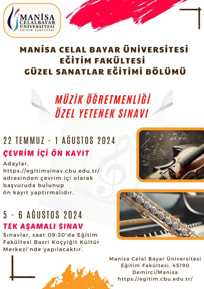 Demirci Eğitim Fakültesi Güzel Sanatlar Eğitimi Bölümü Müzik Öğretmenliği Özel yetenek sınavı için başvurular 22 Temmuz - 1 Ağustos 2024 tarihleri arasında http://egitimsinav.cbu.edu.tr/ adresinden çevrim içi başvuruda bulunup, ön kayıt yaptırmaları gerekmektedir.