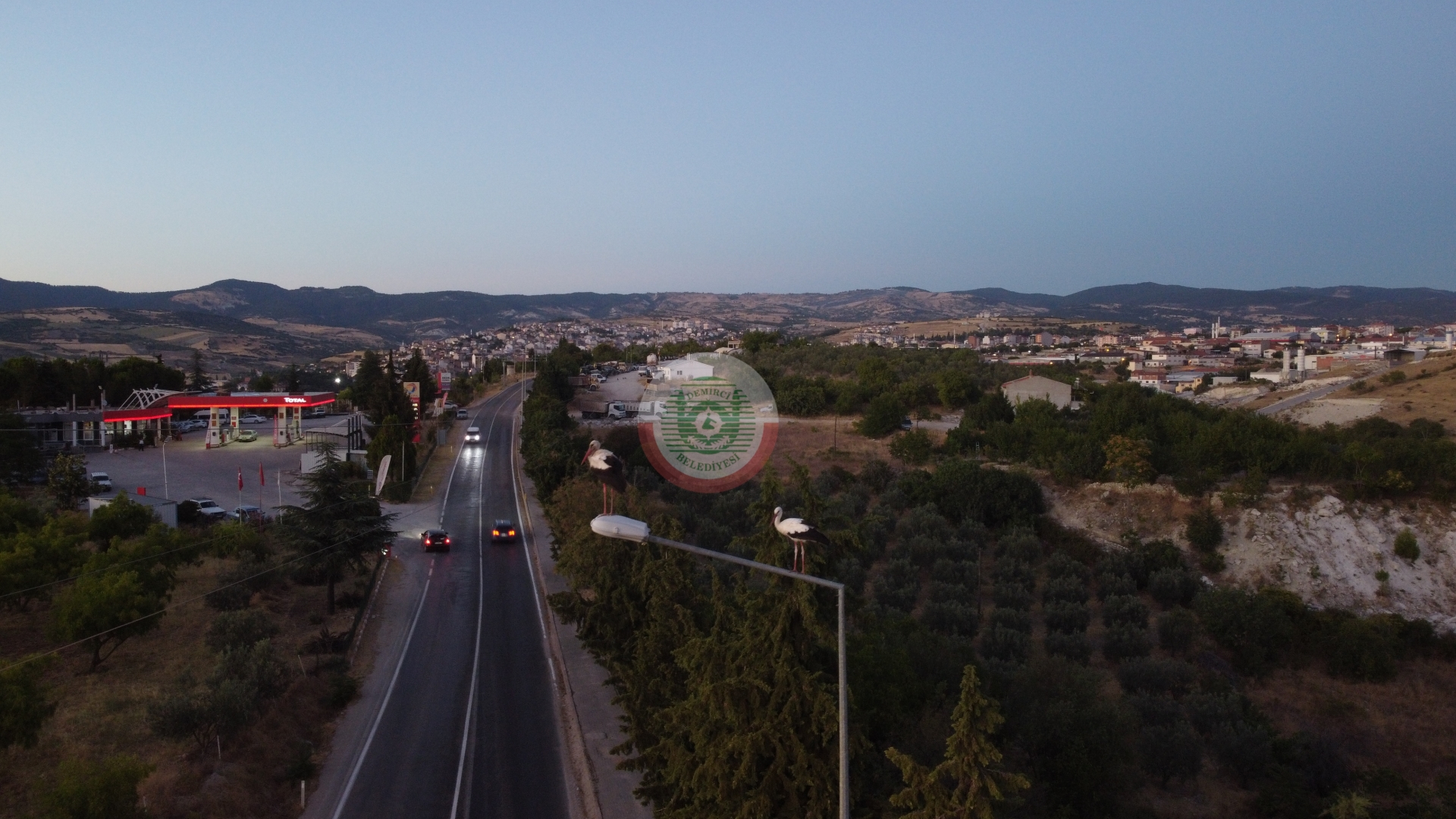 Göç yolundaki çok sayıda leylek İlçe girişinde bulunan hastanenin çatısına ve yol boyunca yer alan aydınlatma direklerine kondu.