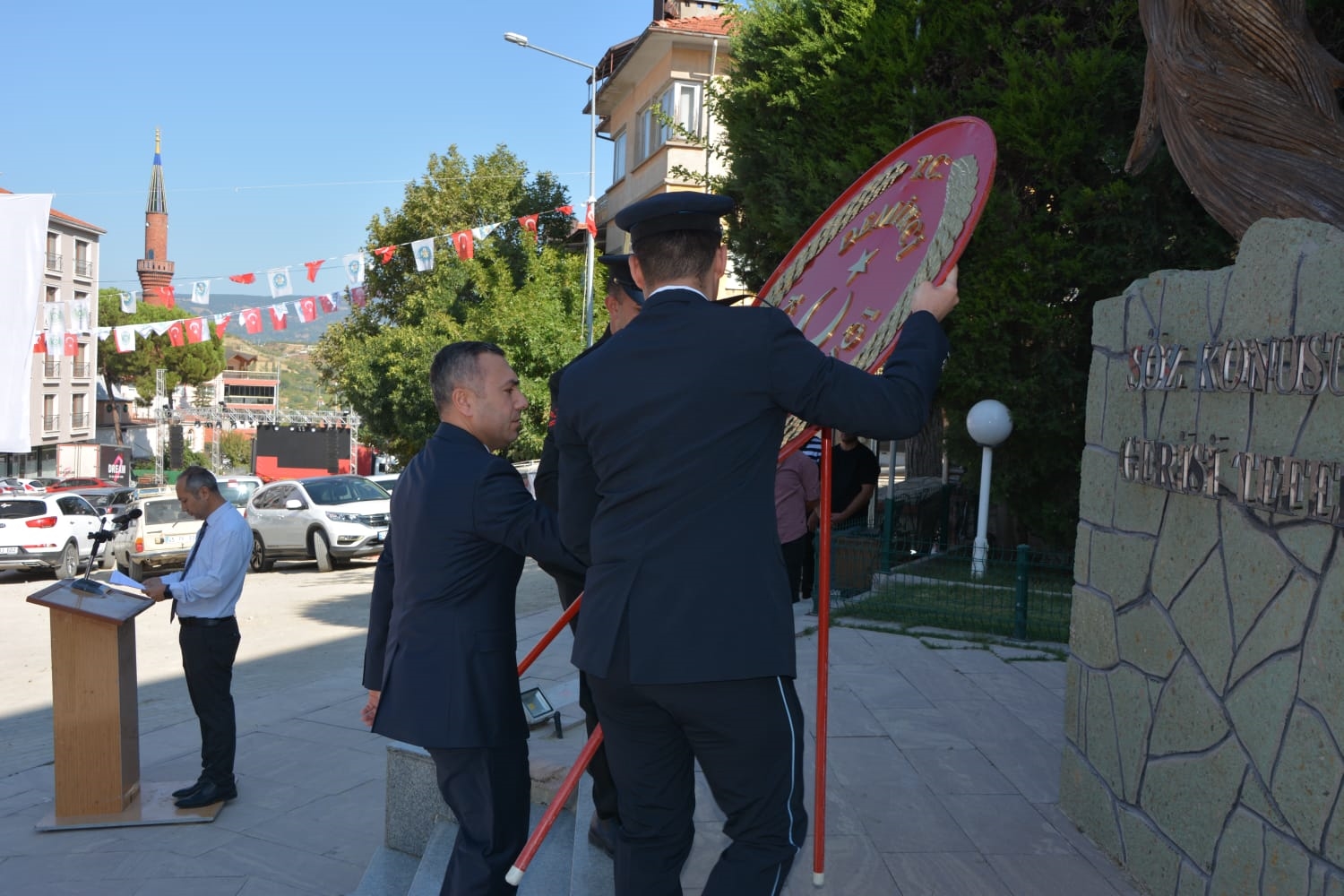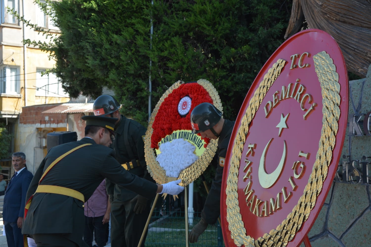 30 Ağustos Cuma günü Zafer Bayramı etkinlikleri kapsamında Kaymakamımız Yavuz Arslan, Garnizon Komutanı Mly. Binbaşı Hüseyin Cihan Korkmaz ve Belediye Başkanımız Erkan Kara tarafından Atatürk anıtına çelenk sunumu yapıldı.