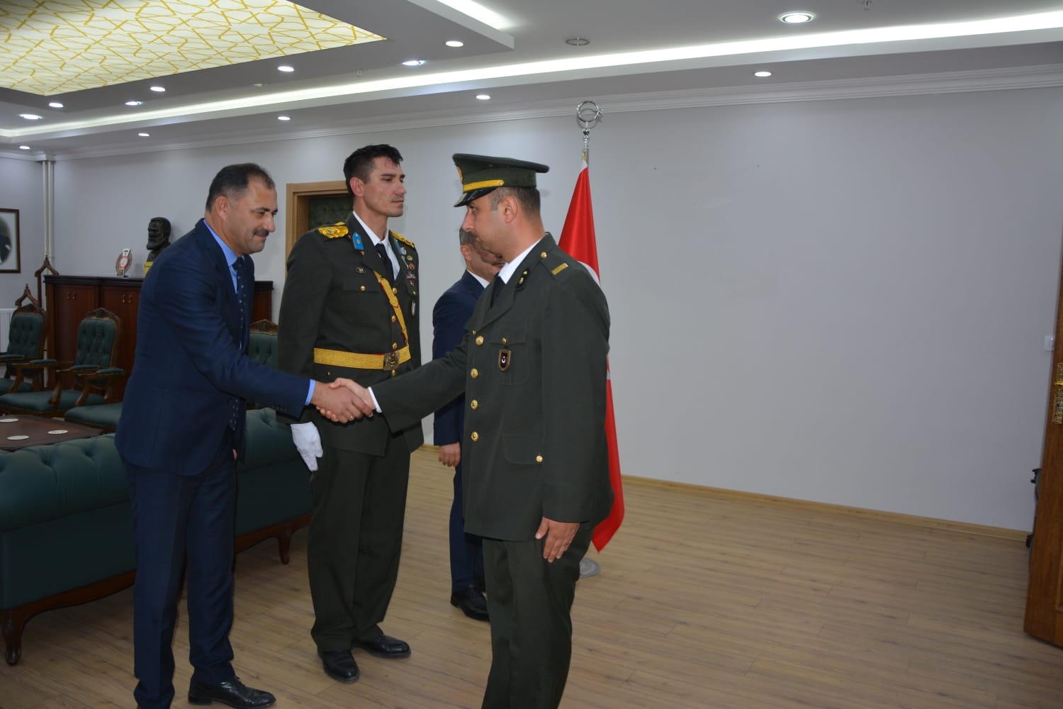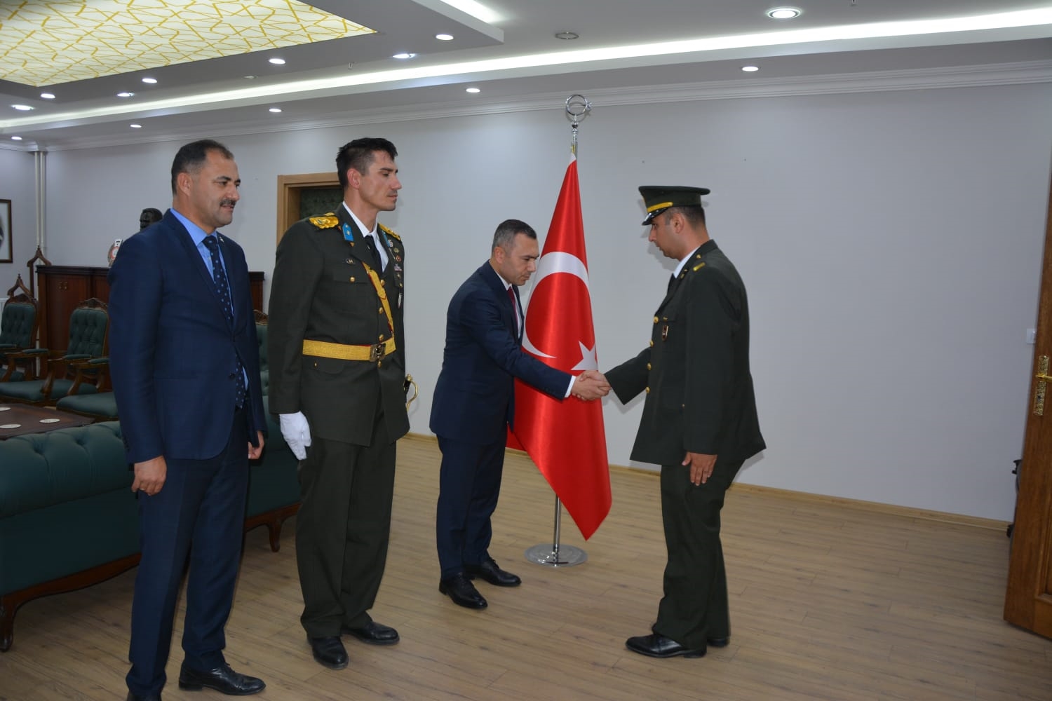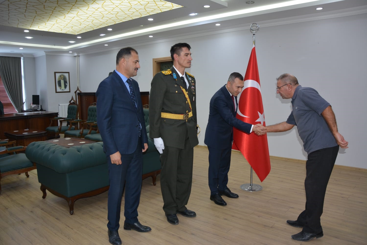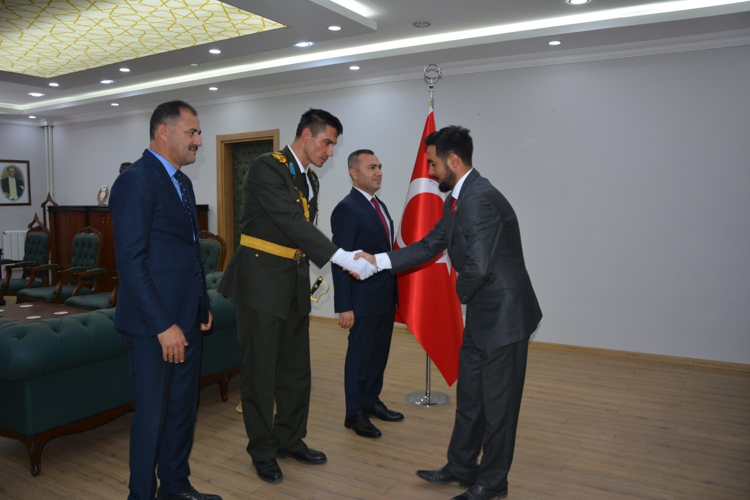 Öğrenciler tarafından okunan şiirlerin ardından Kaymakamımız Yavuz Arslan, Garnizon Komutanı Mly. Binbaşı Hüseyin Cihan Korkmaz ve Belediye Başkanımız Erkan Kara, Kaymakamlık makamında tebrikleri kabul ettiler.