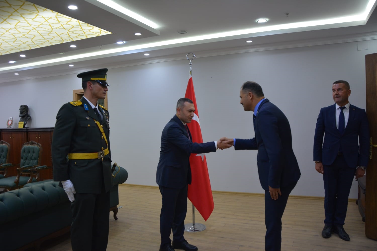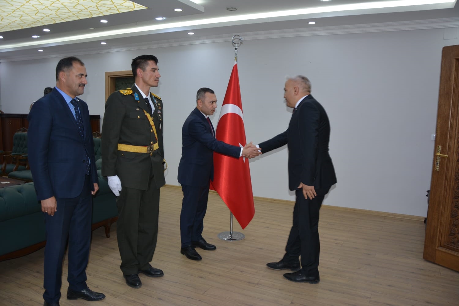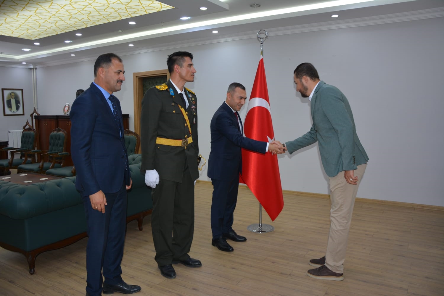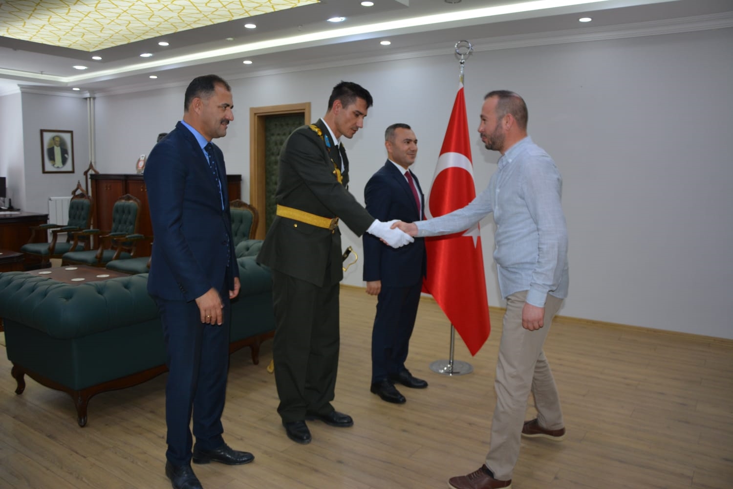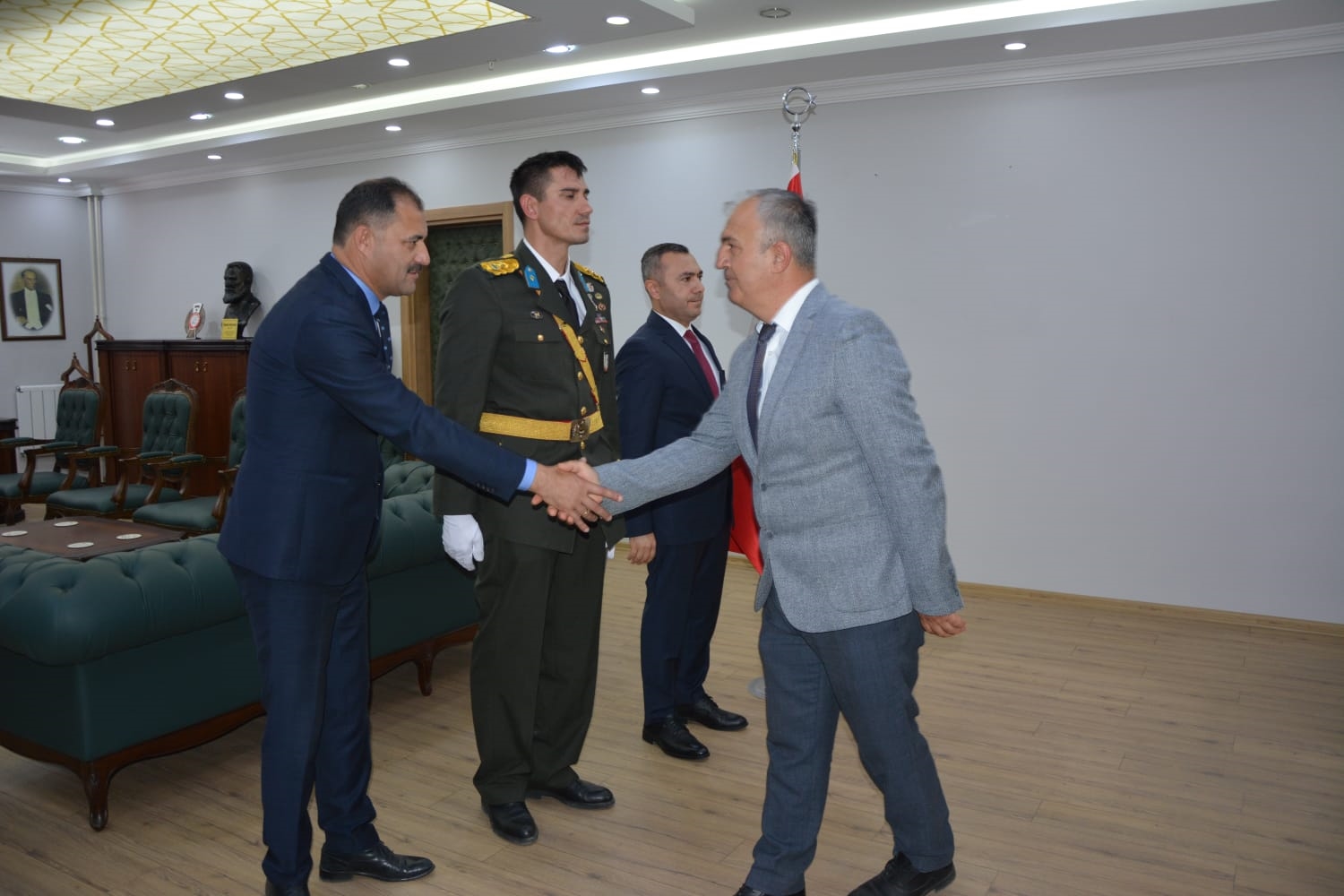 Öğrenciler tarafından okunan şiirlerin ardından Kaymakamımız Yavuz Arslan, Garnizon Komutanı Mly. Binbaşı Hüseyin Cihan Korkmaz ve Belediye Başkanımız Erkan Kara, Kaymakamlık makamında tebrikleri kabul ettiler.