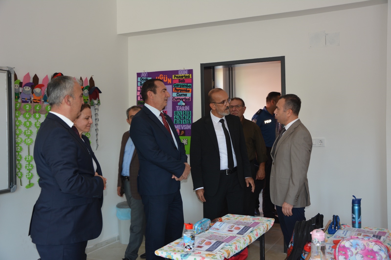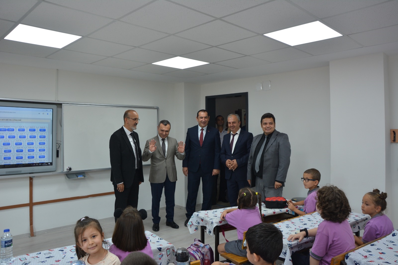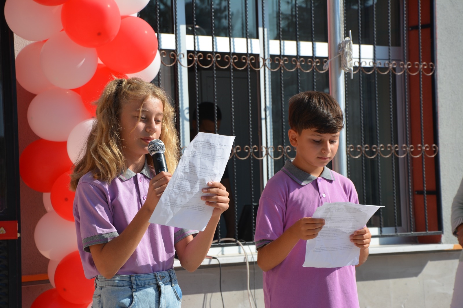 Okula ilk kez başlayan 1. sınıflara yönelik tanışma etkinliğinin düzenlendiği programda öğrenciler Türk bayrakları ile ilçe protokolünü selamladılar.