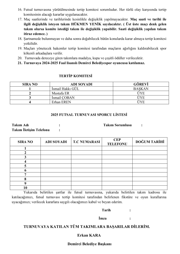 Futsal turnuvasına katılmak isteyenlerin aşağıda bulunan şartname ve başvuru formunu doldurarak Demirci Belediyesi Santral Birimine ulaştırmaları gerekmektedir.