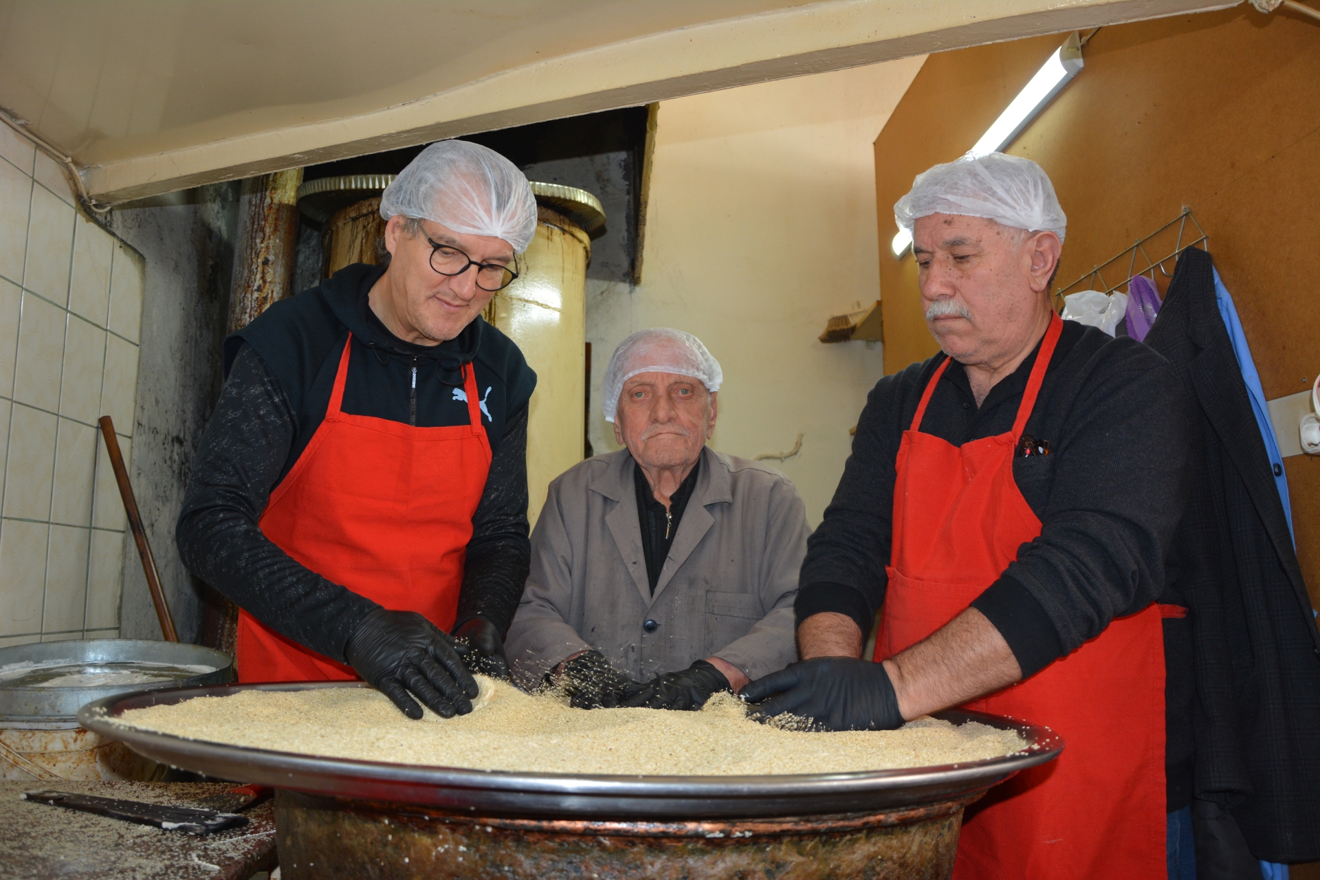 Babasından devraldığı mesleğini sürdüren Helvacı İhsan Akgün helva üretimini yapmak için oğlu Mustafa Akgün ve ailesi ile birlikte sabah erkenden işyerine gelerek baba yadigârı kazanda susamlı helvanın şerbeti hazırlanıyor.