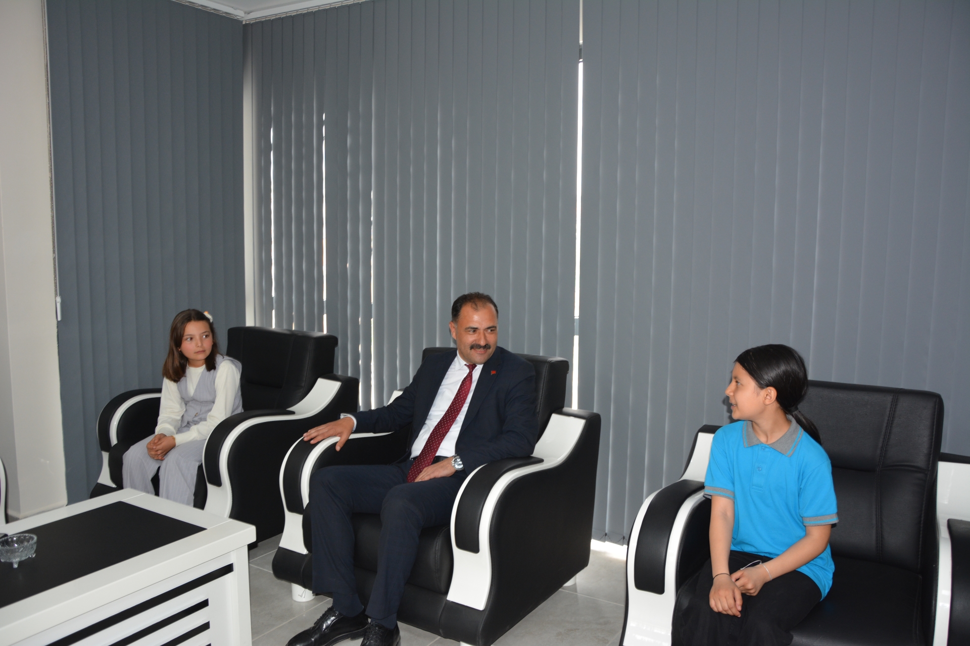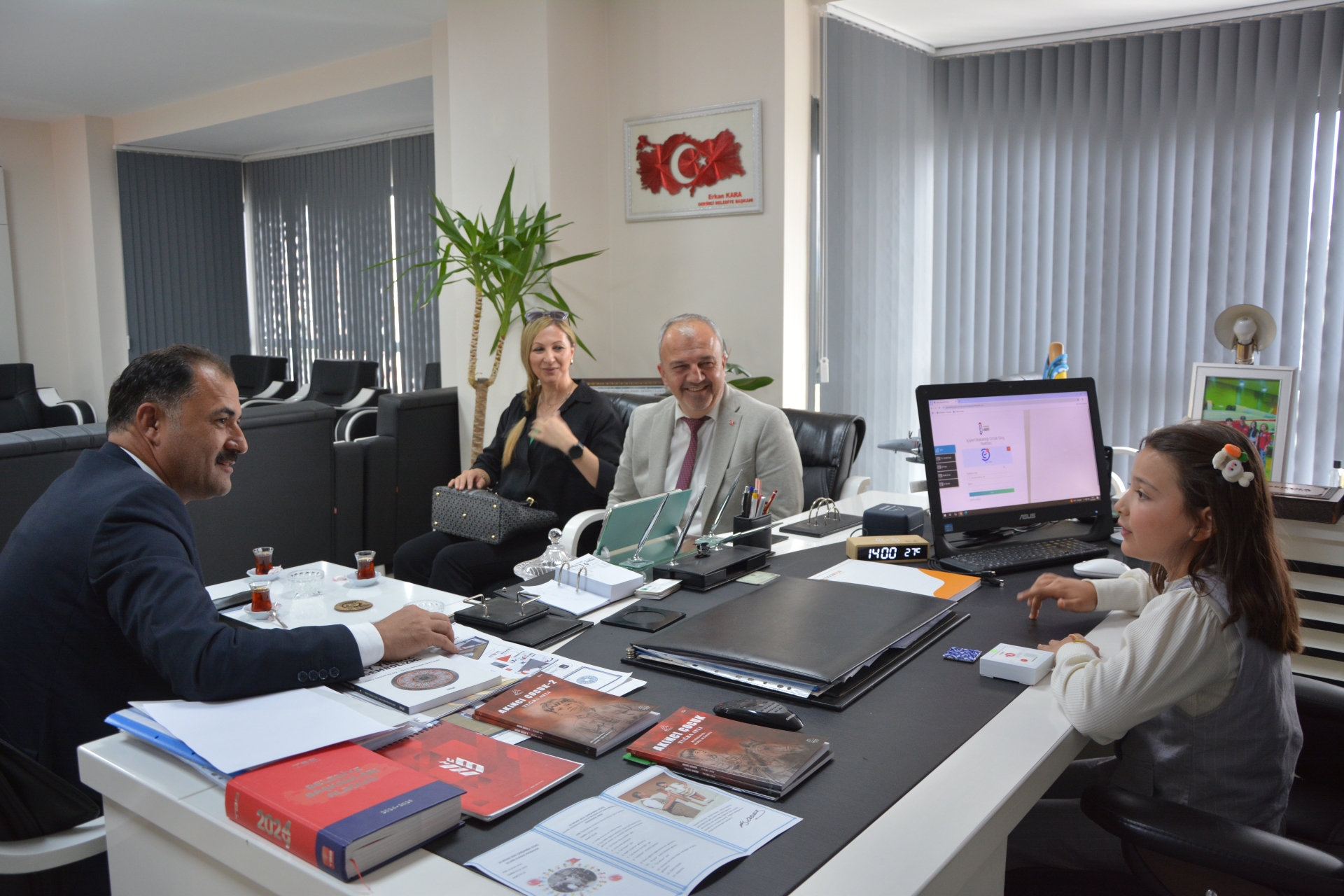 22 Nisan 2025 / Salı günü Fatih Ortaokulu 5 sınıf öğrencisi Ayşe Akkaya, Ziya Gökalp Nurettin Kelem Ortaokulu 5. Sınıf öğrencisi Gülhizar Durak, İlçe Milli Eğitim Müdürü Bilal Çetinkaya, Fatih Ortaokulu Müdürü Öznur Armutçu ve Ziya Gökalp Nurettin Kelem Ortaokulu Müdürü İsmail Çetinkaya, Belediye Başkanımız Erkan Kara’yı makamında ziyaret ettiler.