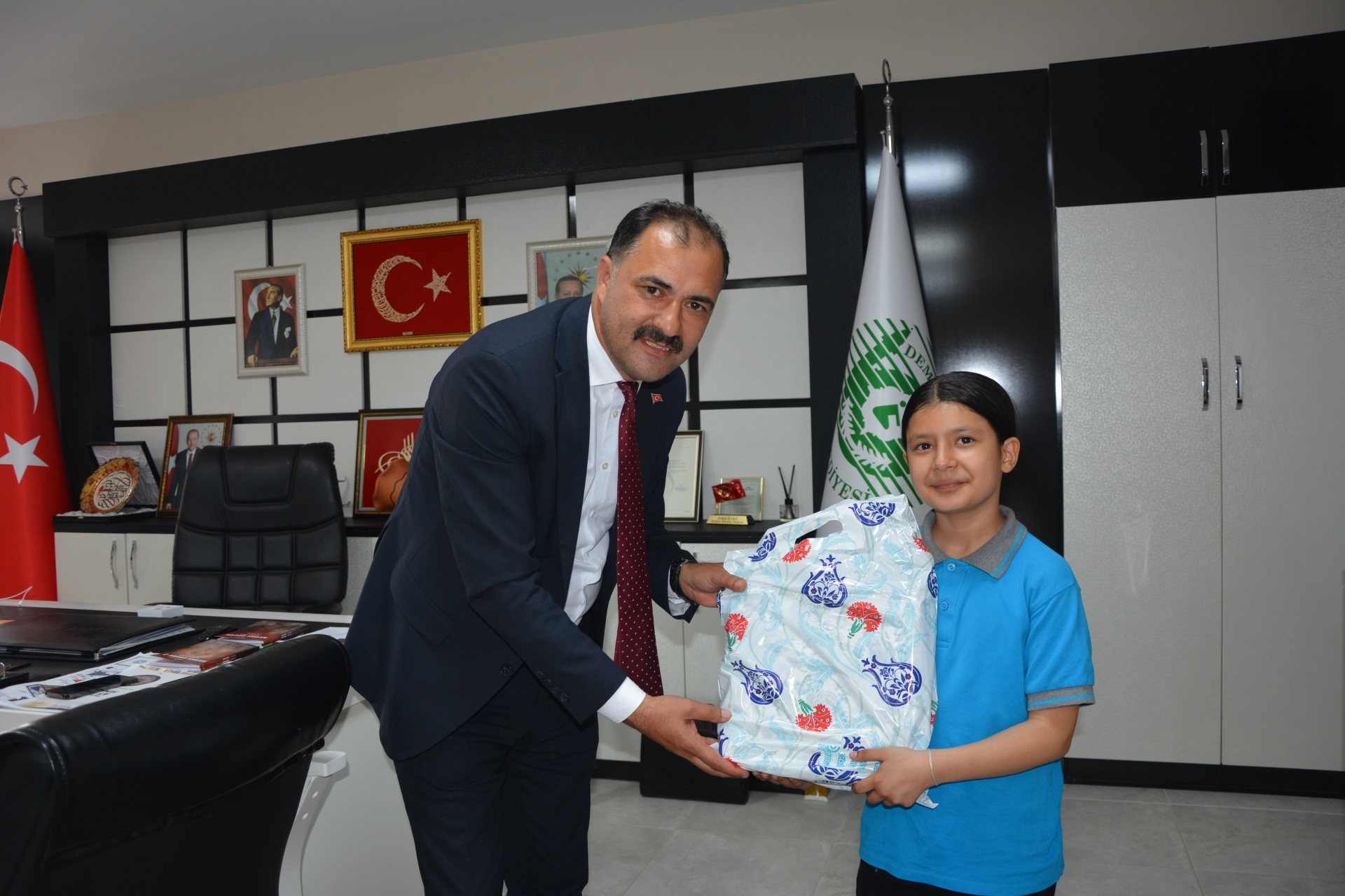Belediye Başkanımız Erkan Kara’da, 23 Nisan Ulusal Egemenlik ve Çocuk Bayramı dolayısıyla Fatih Ortaokulu 5 sınıf öğrencisi Ayşe Akkaya ve Ziya Gökalp Nurettin Kelem Ortaokulu 5. Sınıf öğrencisi Gülhizar Durak’a günün anısına çeşitli hediyeler takdim ederken, eğitim hayatlarında sonsuz başarılar diledi.