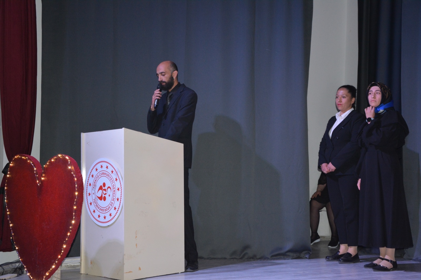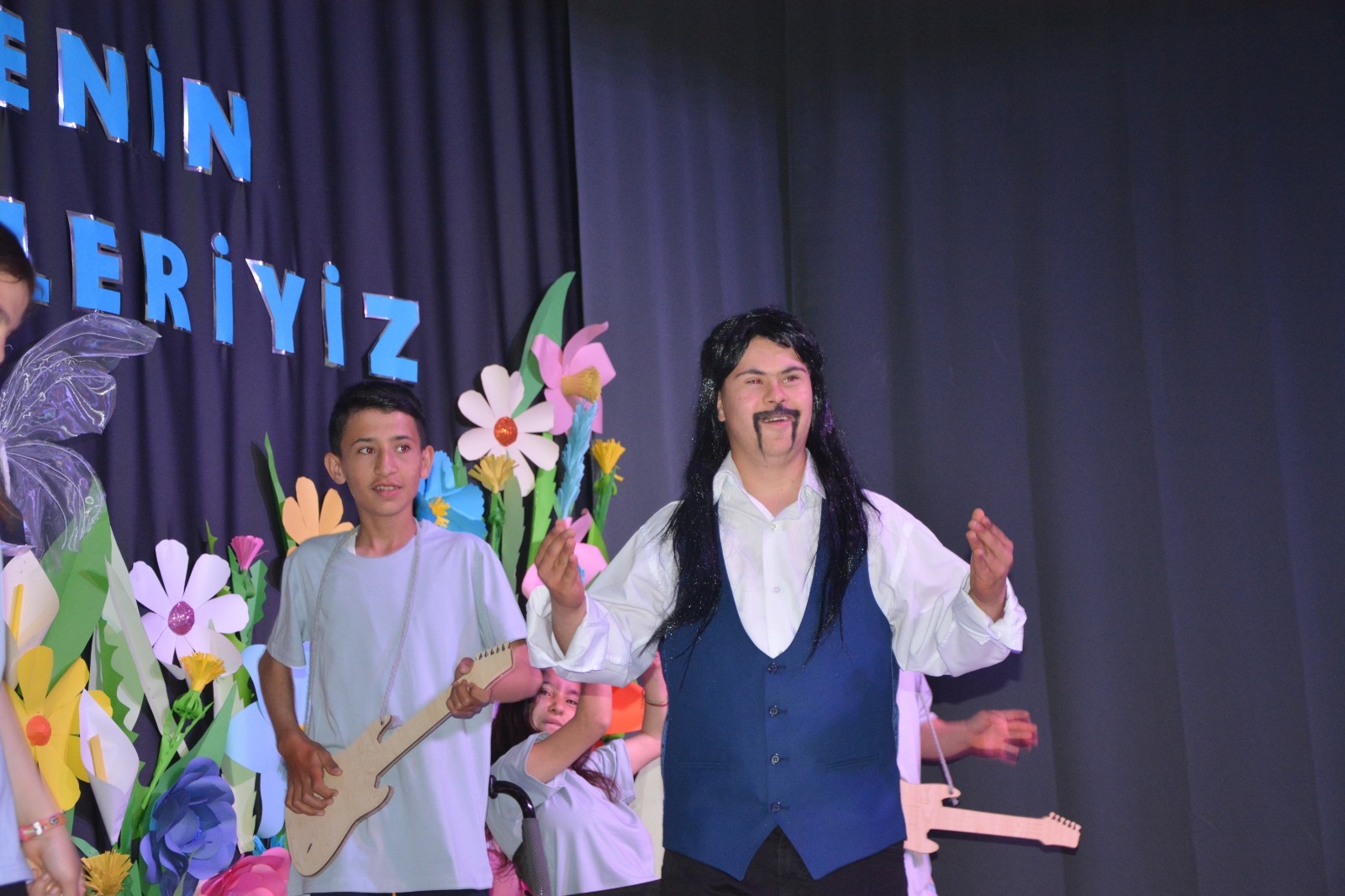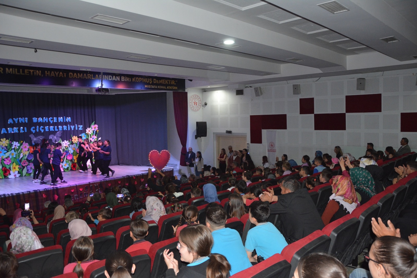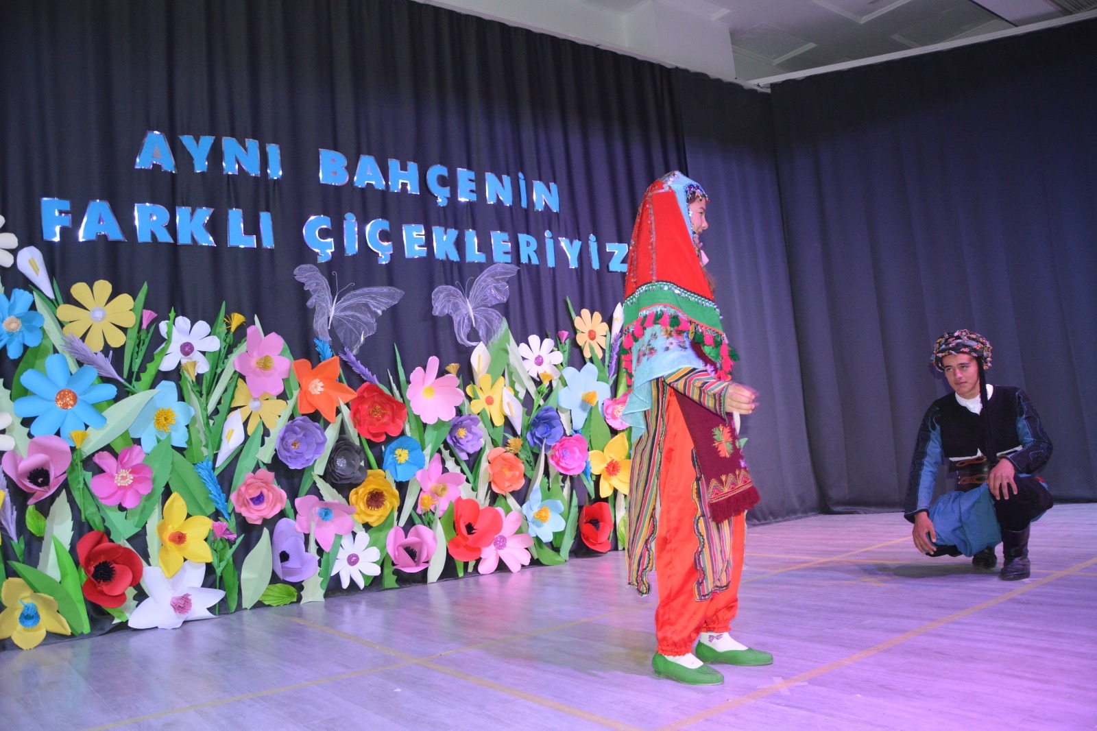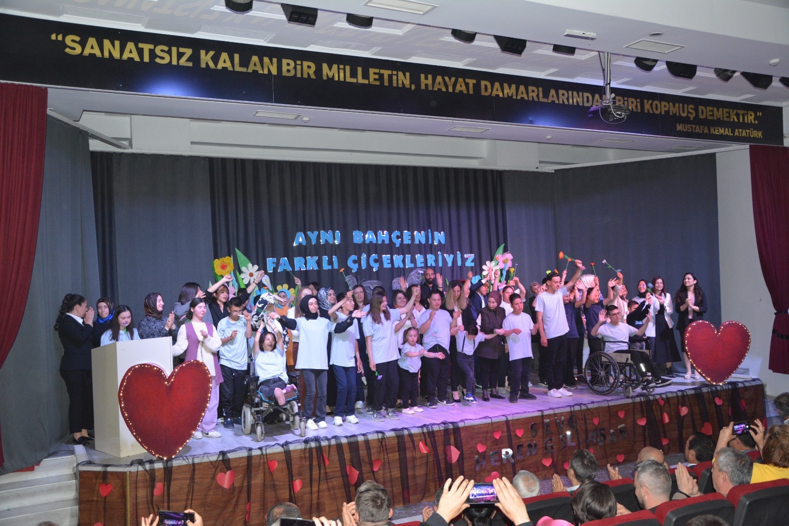Programda okul öğretmenleri Dürdane Çataler ve Mürüvvet Hepyürekliler koordinasyonunda çiçek figürleri ile hazırlanan “Hepimiz Aynı Bahçenin Farklı Çiçekleriyiz” mesajı veren bu dekor öğrencilerin gösterisi ile duygu dolu anlara sahne oldu.