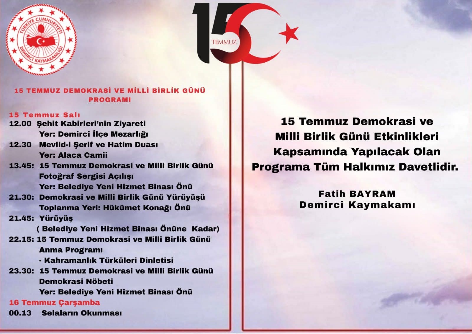 15 TEMMUZ DEMOKRASİ VE MİLLİ BİRLİK GÜNÜ PROGRAMI