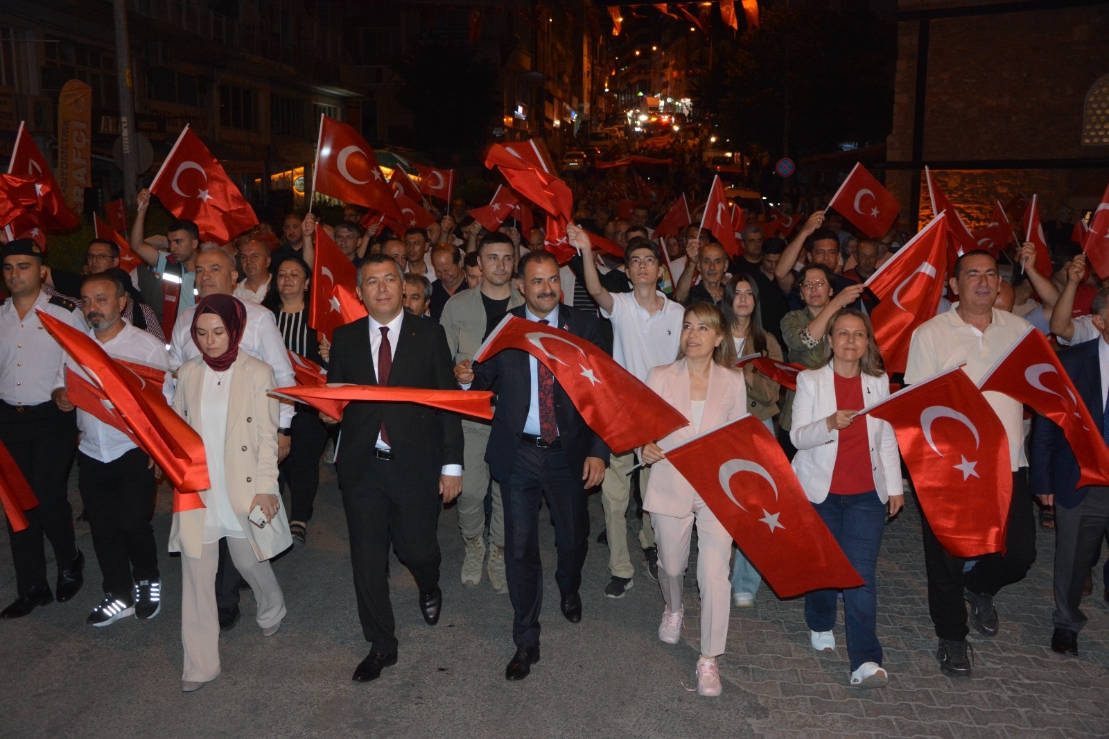 Yürüyüşte İlçe halkı ve gençler 200 metre uzunluğunda dev Türk bayrağı açarak yürüdüler.