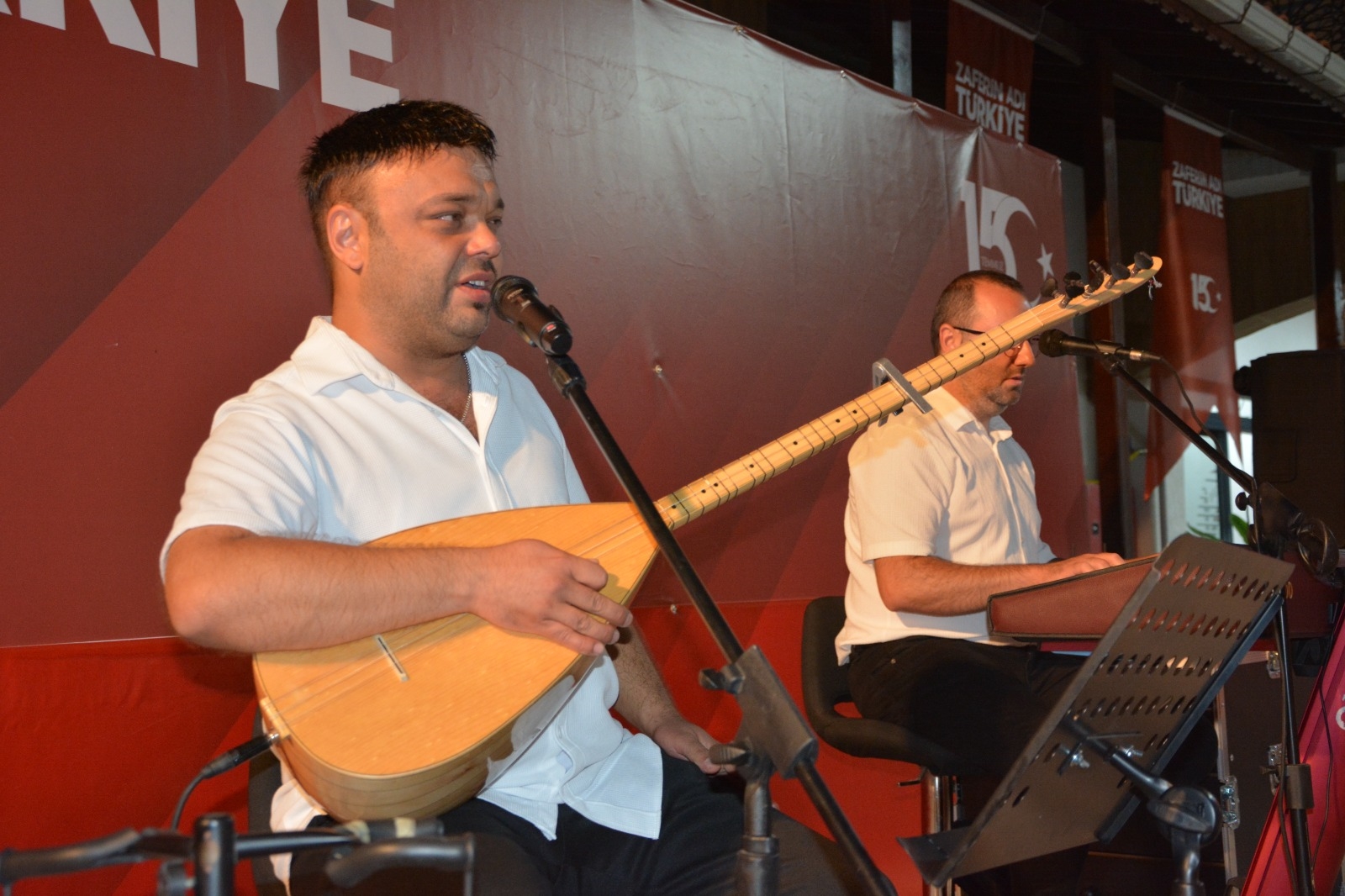 Demirci Belediyesi önünde gerçekleştirilen Demokrasi Nöbetinde Kuran-ı Kerim Tilaveti ve dualar okunurken, İlçedeki müzik öğretmenleri tarafından da kahramanlık türküleri seslendirildi.