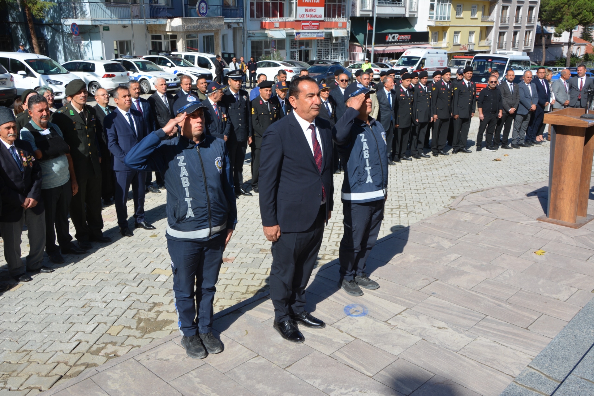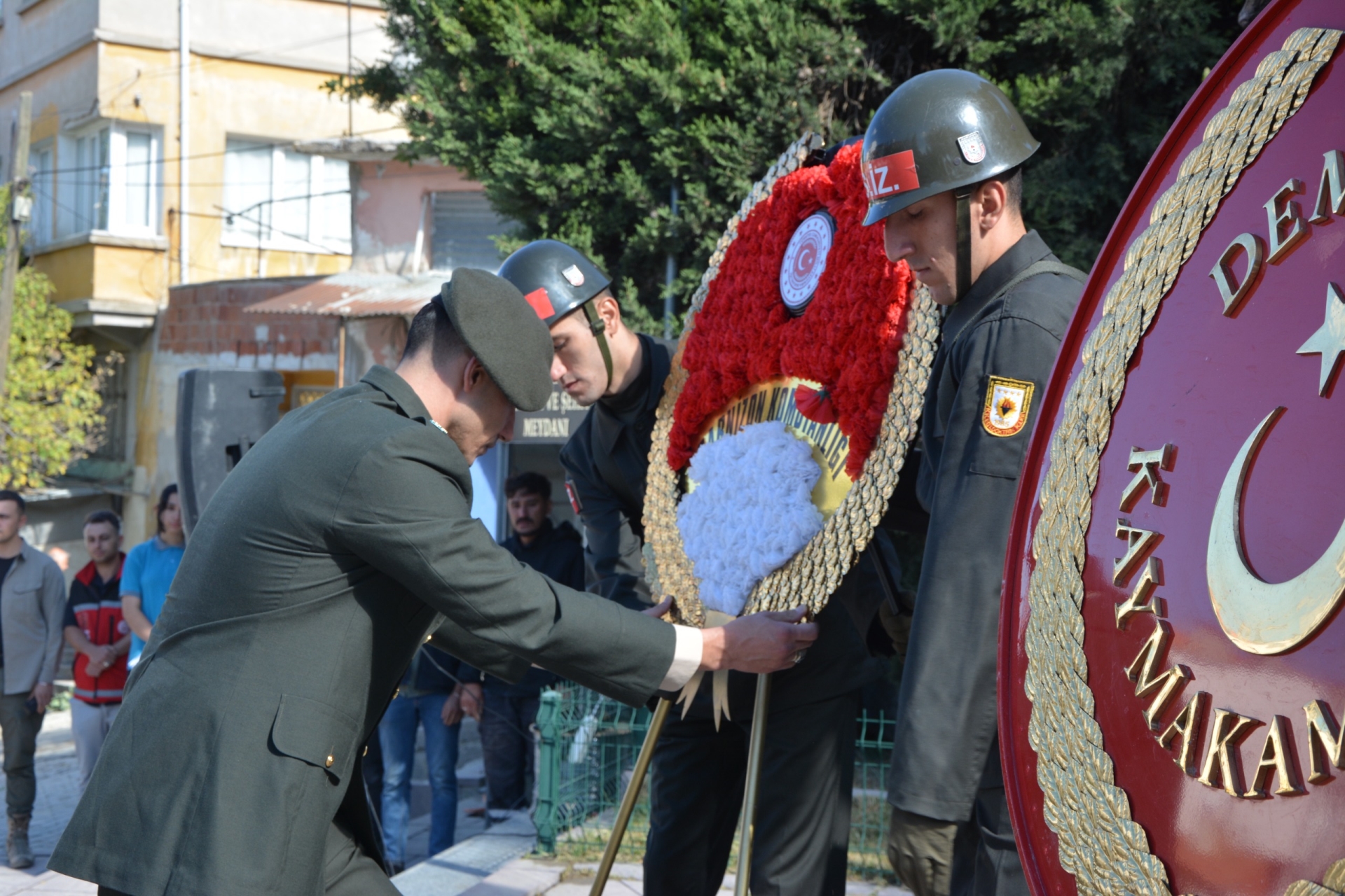 Törende ilk olarak Kaymakamımız Fatih Bayram, Belediye Başkan Yardımcımız İsmail Hakkı Gül, Garnizon Komutanı Mly. Binbaşı Hüseyin Cihan Korkmaz ve Demirci Muharip Gaziler Derneği Başkanı Kamil Aydemir tarafından Atatürk anıtına çelenk sunumu yapıldı.