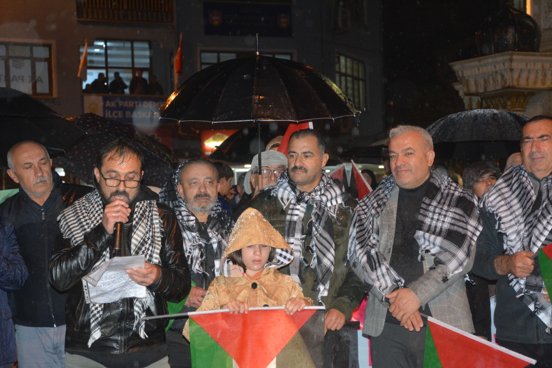 Yürüyüşe katılan vatandaşlar yağmur altına Filistin şarkıları ile birlikte Filistin’e Özgürlük sloganları ve tekbirlerle yürüdü.