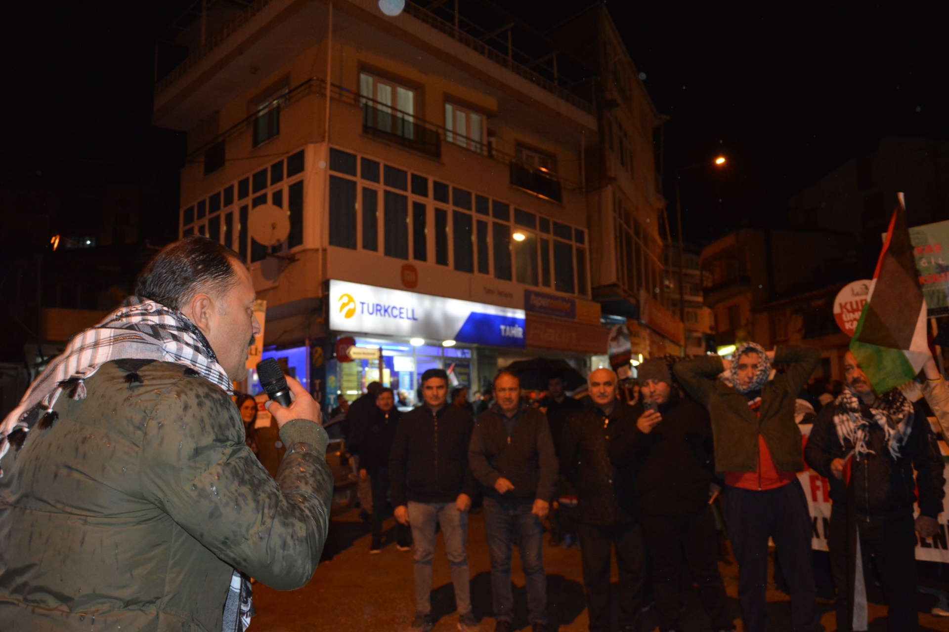Çereşe meydanına kadar devam eden yürüyüşün ardından konuşma yapan Belediye Başkanımız Erkan Kara “ Siyonist İsrail’in Filistin üzerine kurmuş olduğu barbarca haince bir soykırımı protesto etmek için bir kez daha haykırıyoruz. Kahrolsun İsrail, Yaşasın Filistin. Tüm zalimlerin karşısında duran, Dünya beşten büyüktür diyen bir Dünya Liderimiz. İyiki Türkiye var. İyiki Recep Tayyip Erdoğan Var ”dedi.