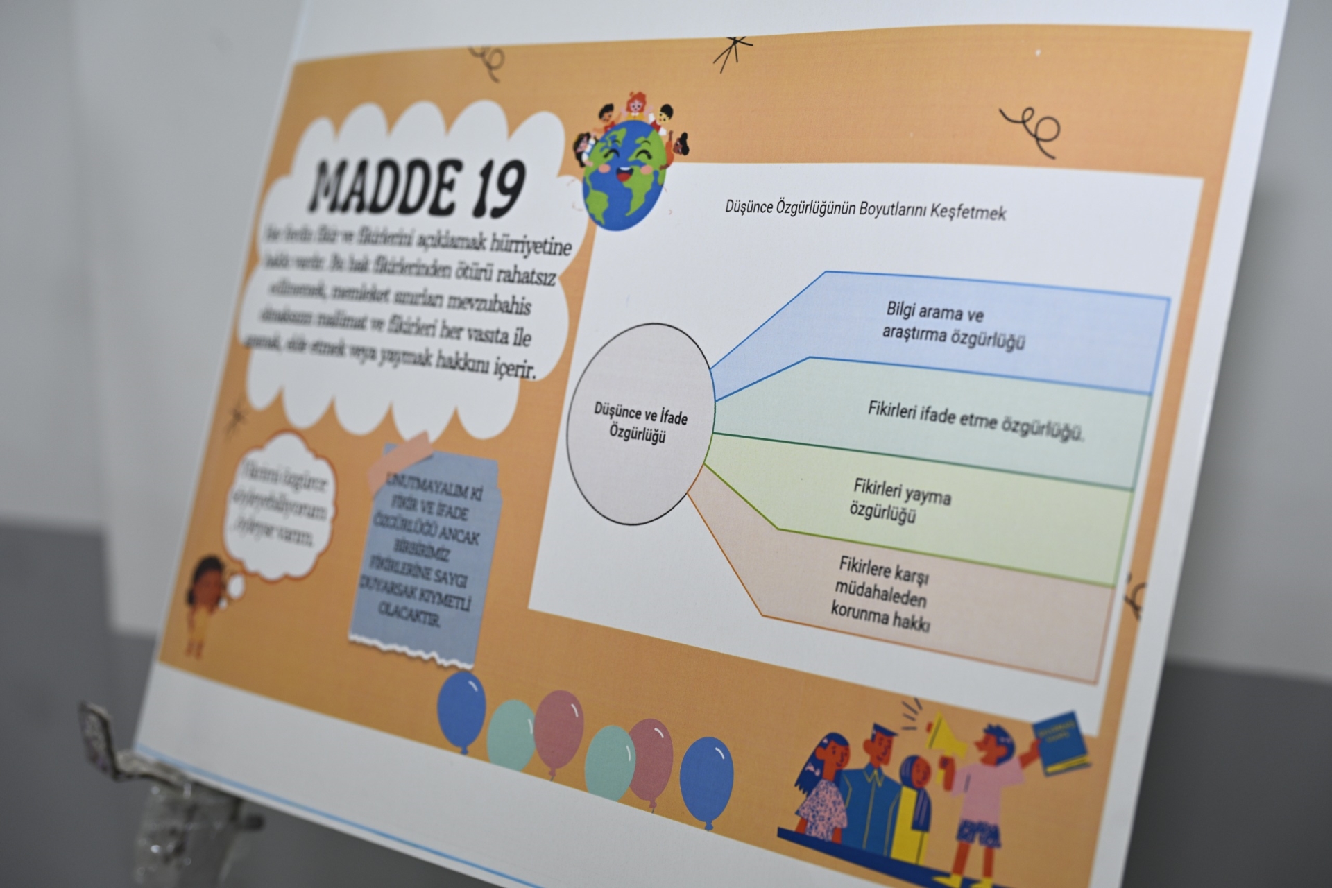 Posterler, el çalışmaları ve kısa mesaj kartlarıyla hak ve özgürlüklerin anlamını kendi ifadeleriyle anlatan çocuklar, günün ruhuna uygun renkli bir atmosfer oluşturdu.