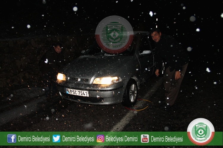 Yetkililer kar yağışının yoğun olduğu Demirci – Simav karayolu Bin 470 rakımlı Akçakertik mevkiine zincir, çekme halatı ve kar lastiği bulunmayan araçların çıkışına izin vermiyor.