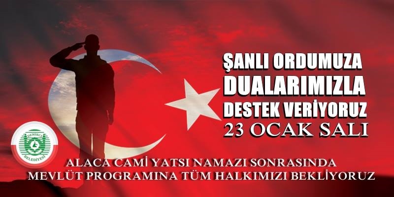 Demirci Belediyesi tarafından da Afrin operasyonunda mücadele veren güvenlik güçlerimiz için 23 Ocak Salı ( Bu Akşam ) yatsı namazı sonrasında Alaca camiinde mevlit programı düzenlenecek.