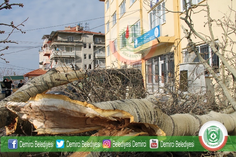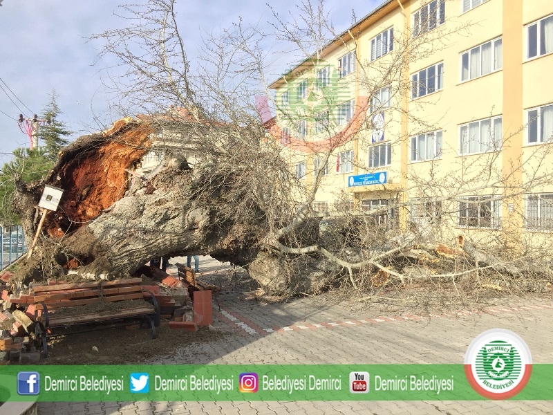 Demirci Meslek Yüksek Okulu bahçesinde bulunan yaklaşık 2 asıra tanıklık eden çınar yapraklı akçaağaç devrildi.
